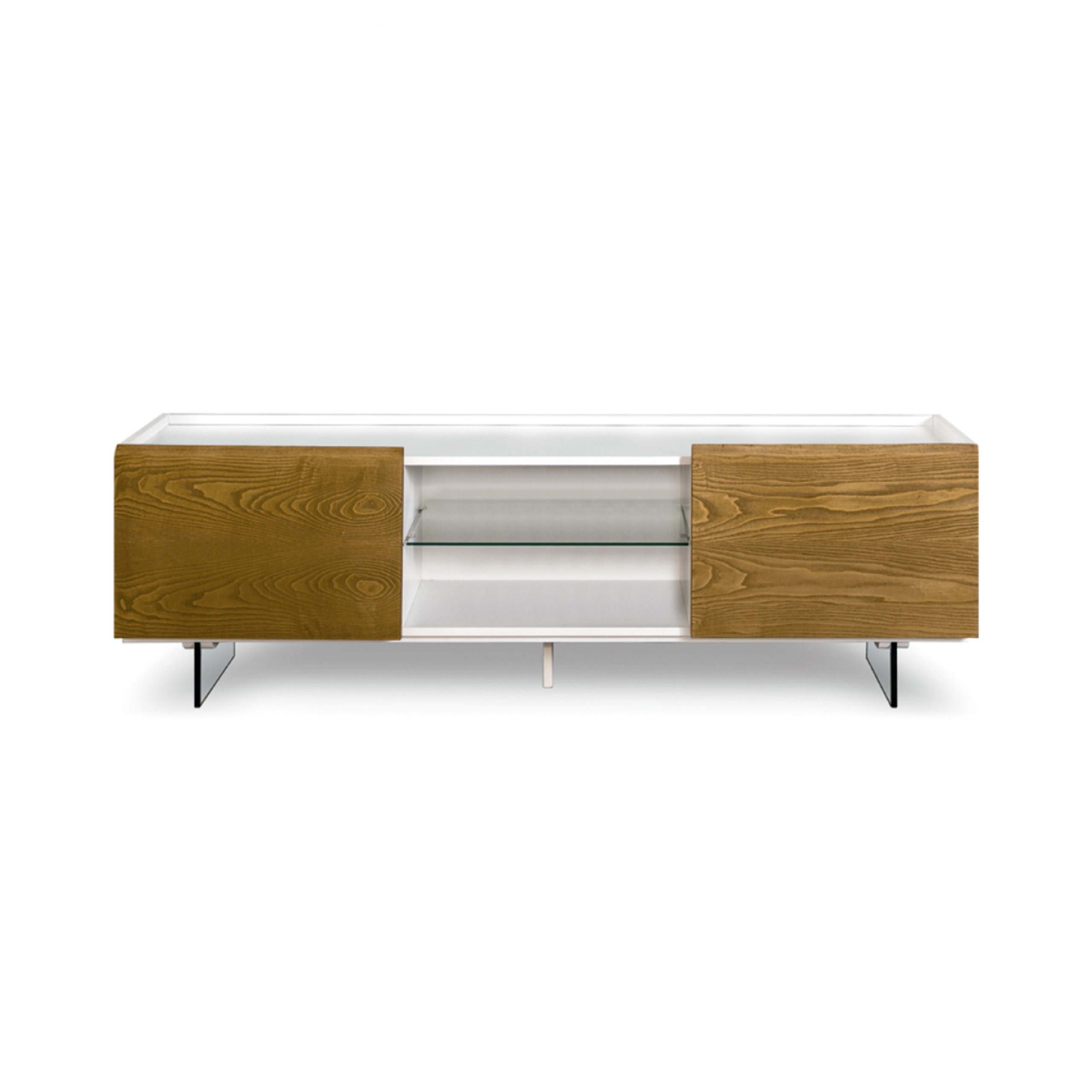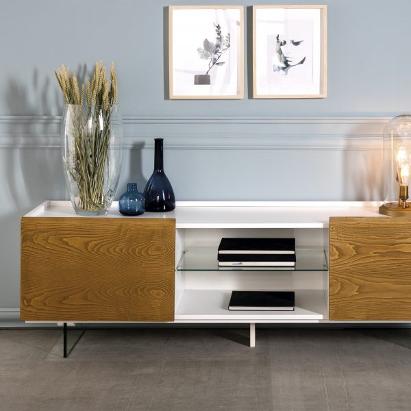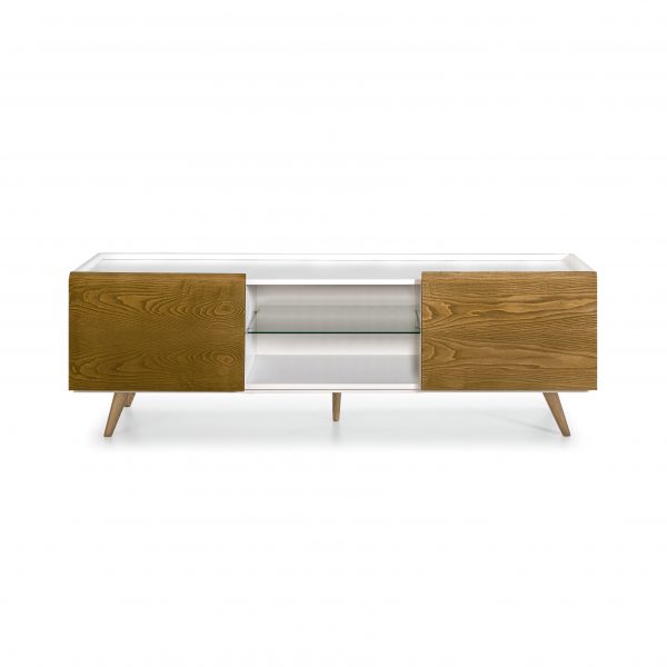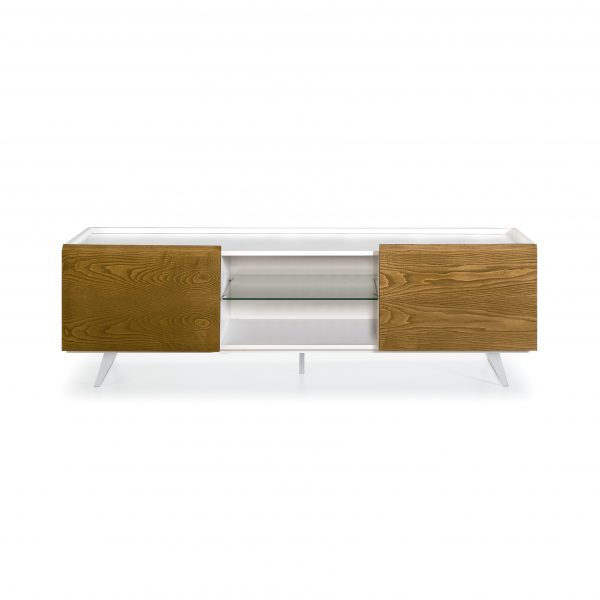 Mueble tv configurable en color natural y caramel y patas disponibles en cristal, metal blanco o cónica de madera.