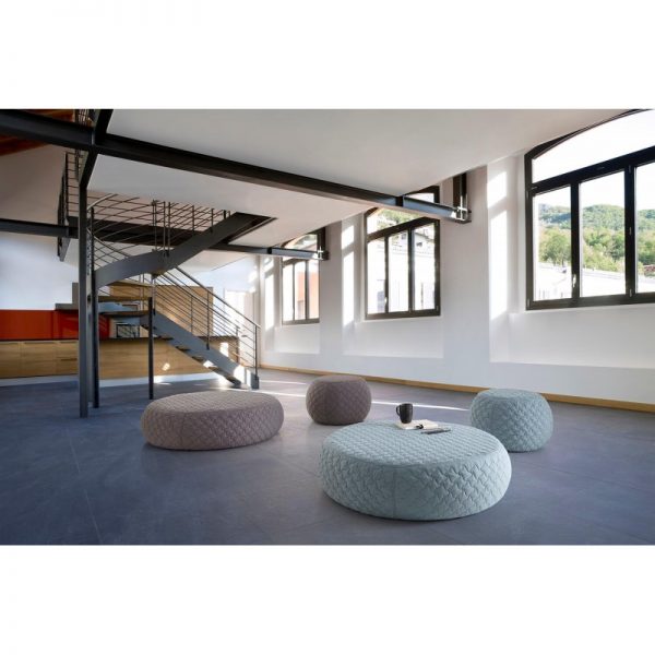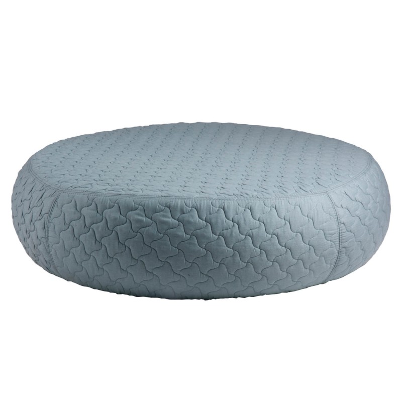 Puff redondo tamaño grande de 101cm de diametro. Espuma de alta densidad 24. Estructura de madera y tapizado en tela acolchada 3D.