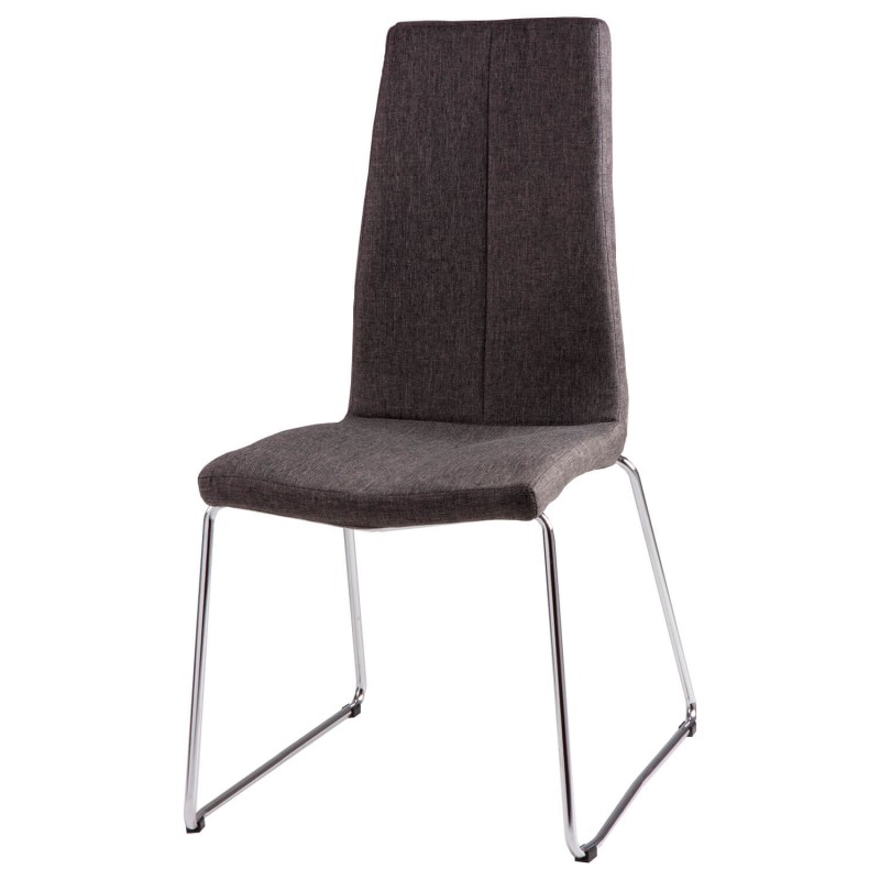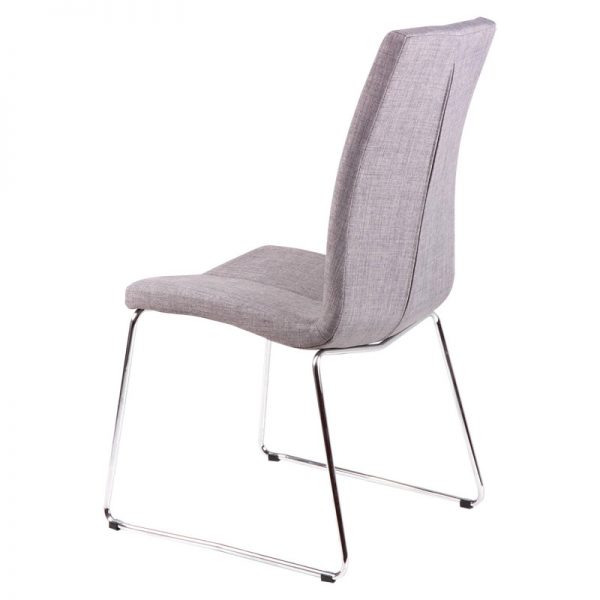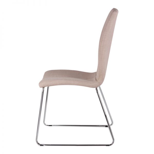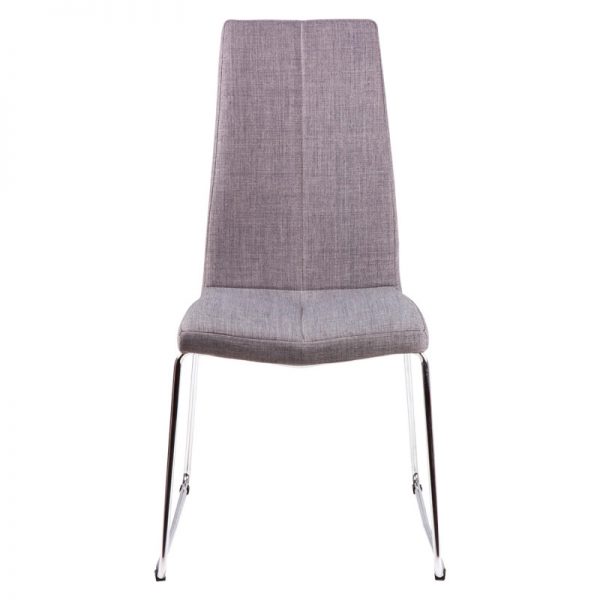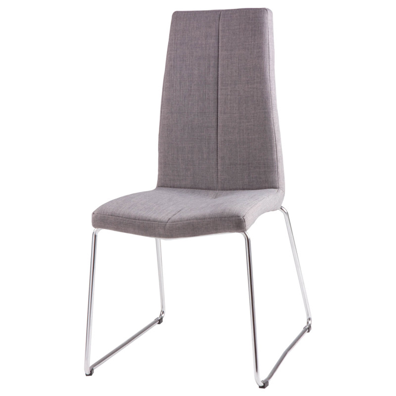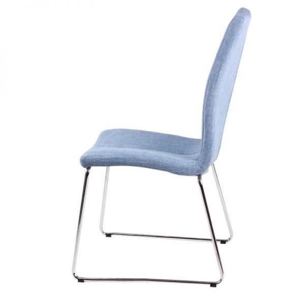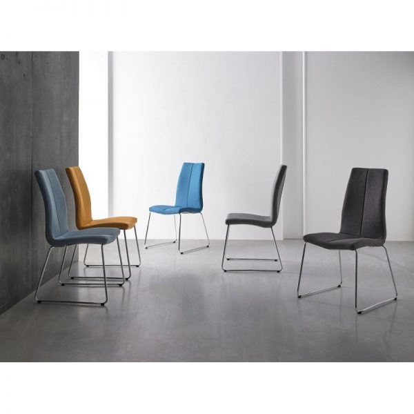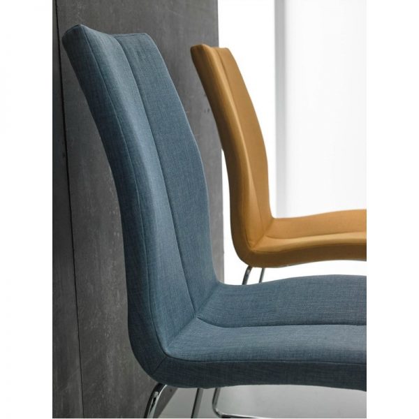 Silla tapizada con estructura de acero y patas cromadas, muy ligera y de diseño sencillo y original.