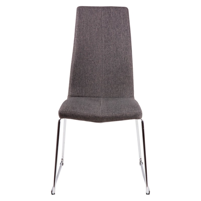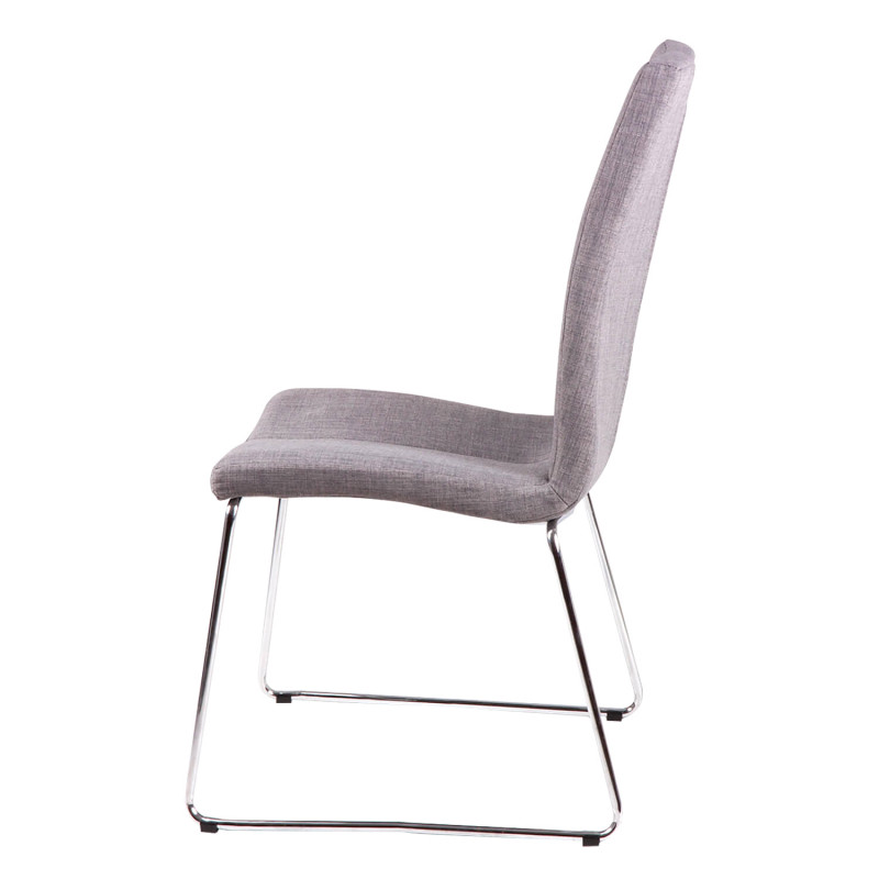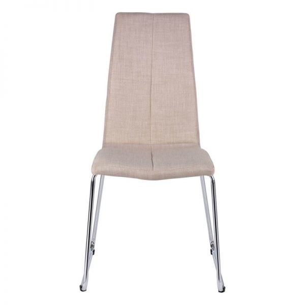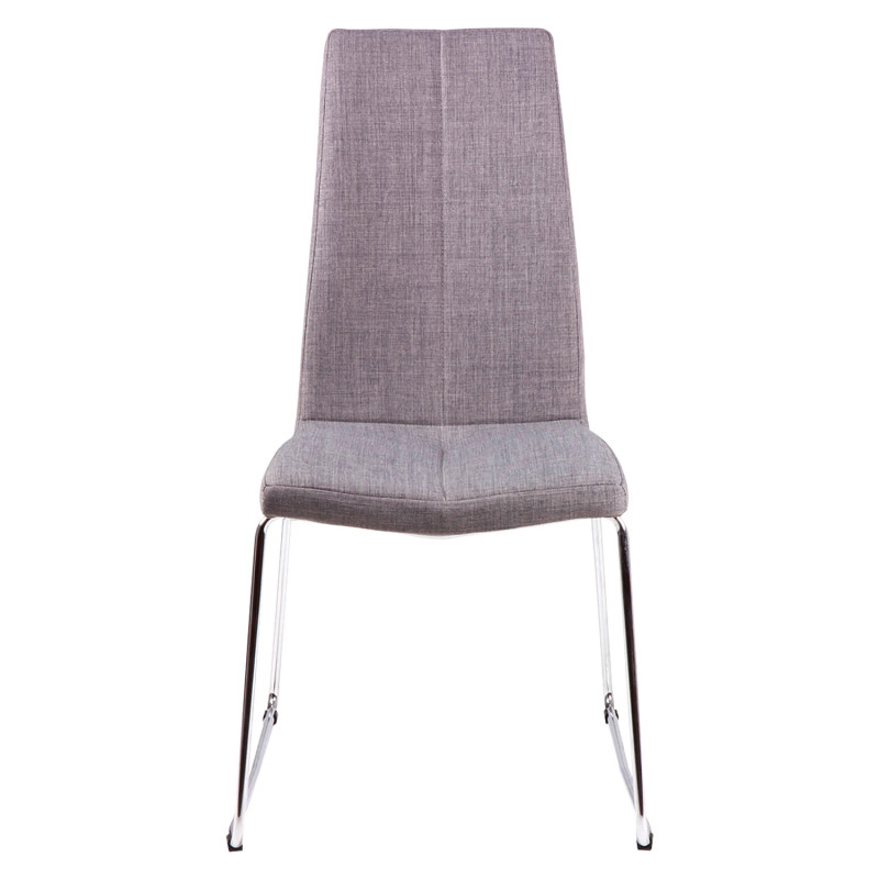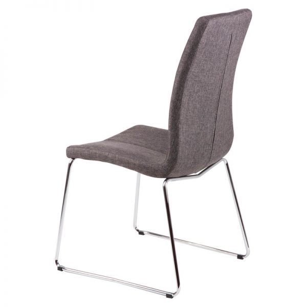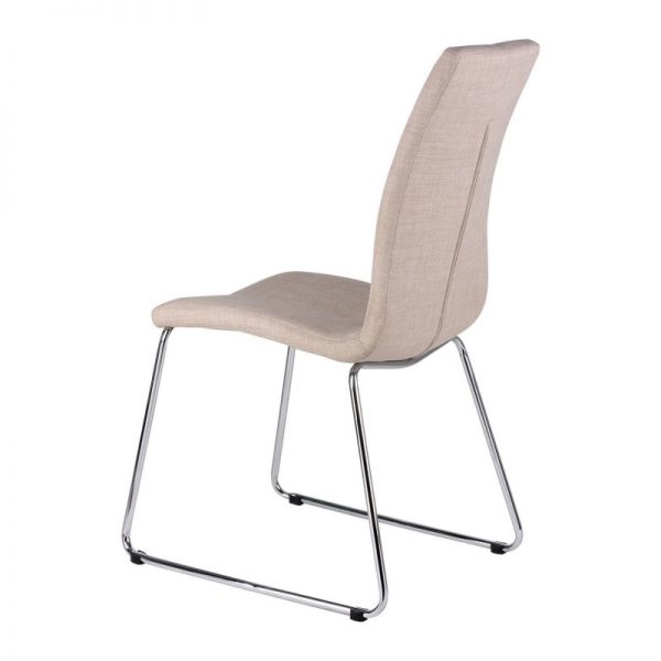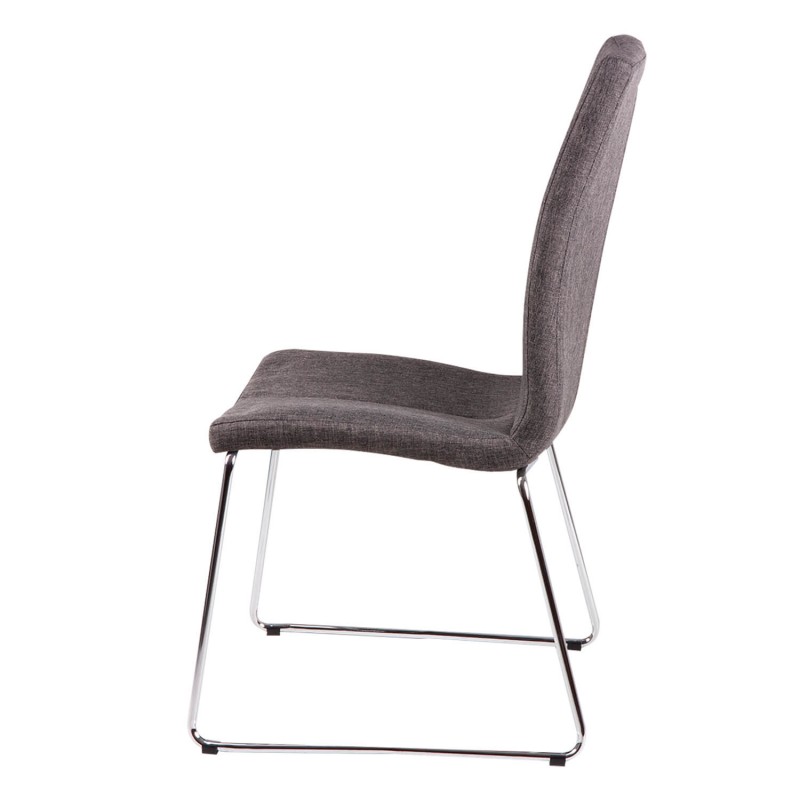 Silla tapizada con estructura de acero y patas cromadas, muy ligera y de diseño sencillo y original.