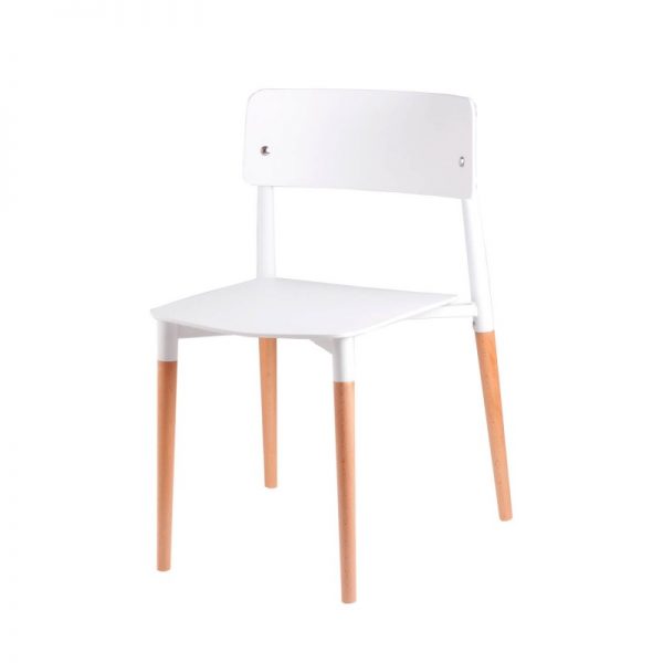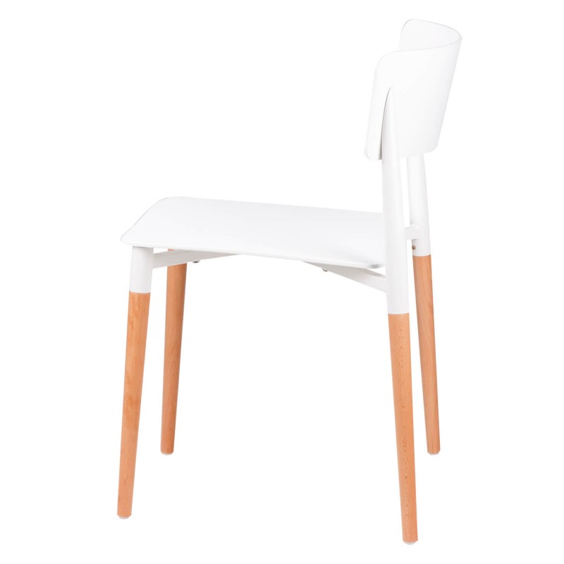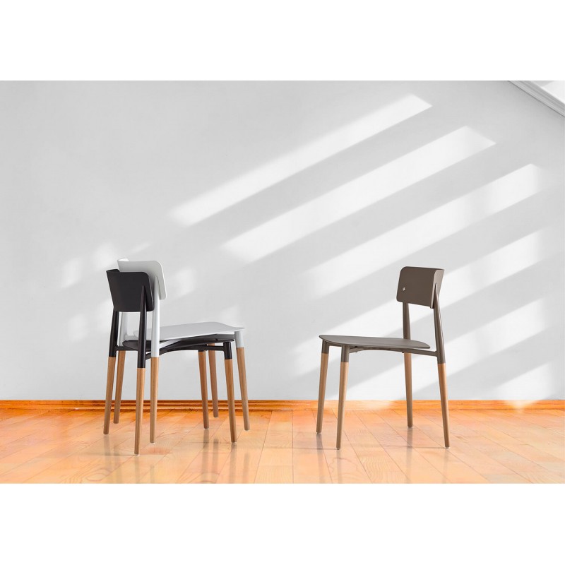 Silla de plástico de diseño ligero y sencillo que combina su estructura de polipropileno con la madera de haya de las patas.