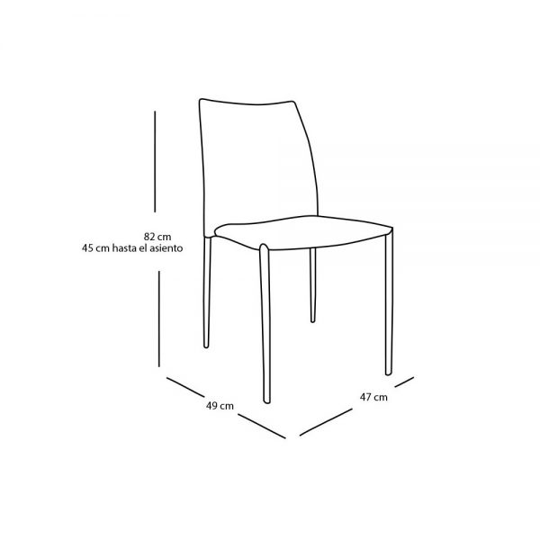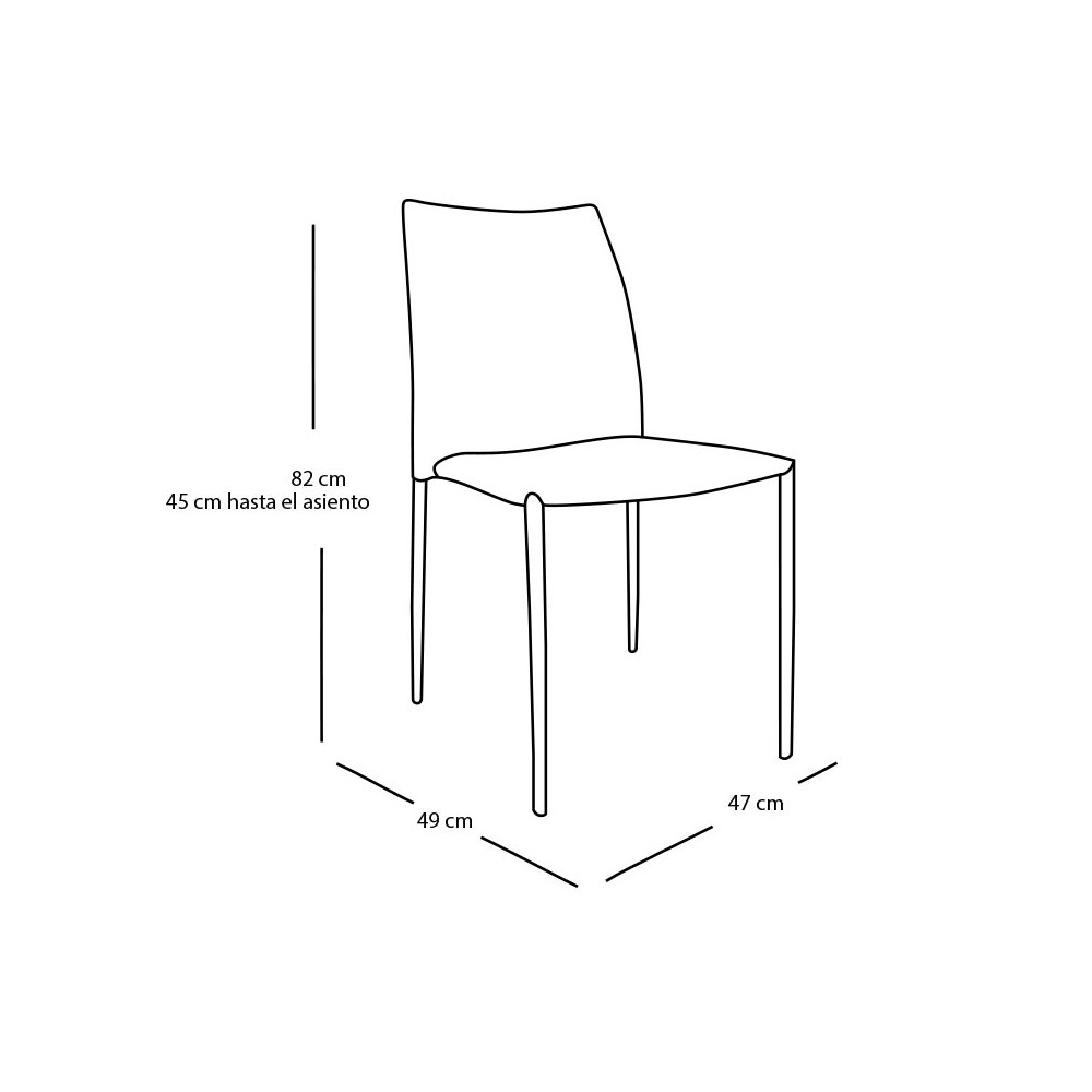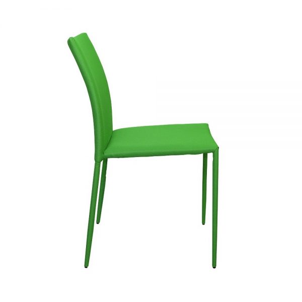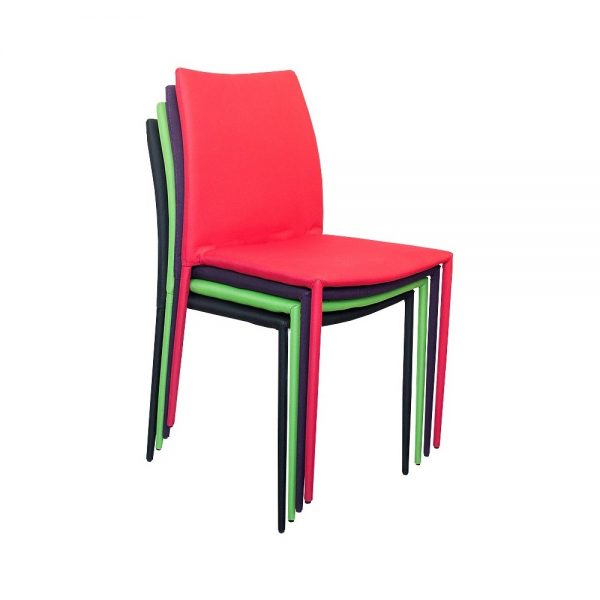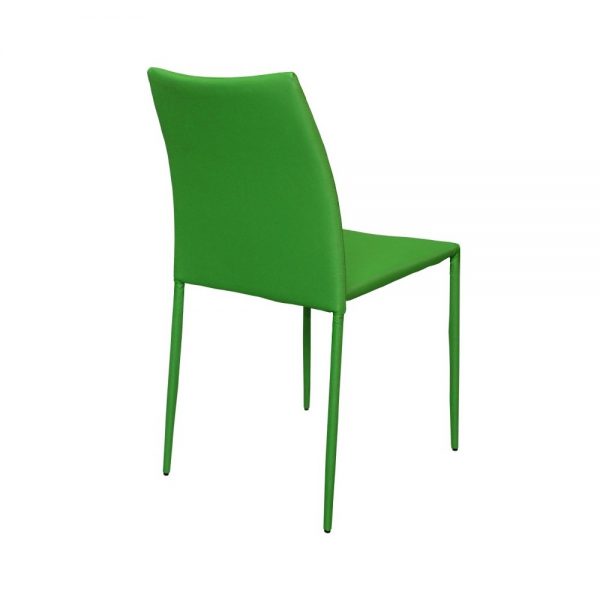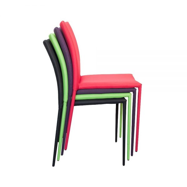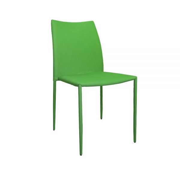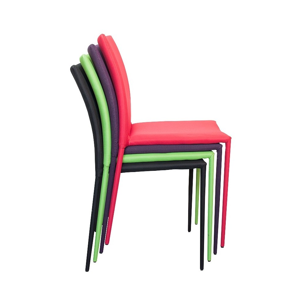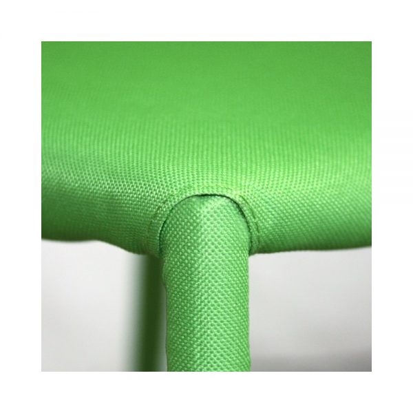 Silla apilable de estructura metálica tapizada en poliéster verde.