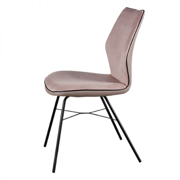 Silla de comedor en tono cálido beige, con acabado en tela súper suave con tacto aterciopelado. A ello se añade que la parte trasera esta fabricada en piel sintética o polipiel, un detalle de gran calidad