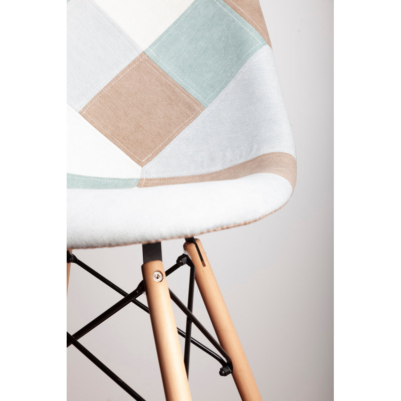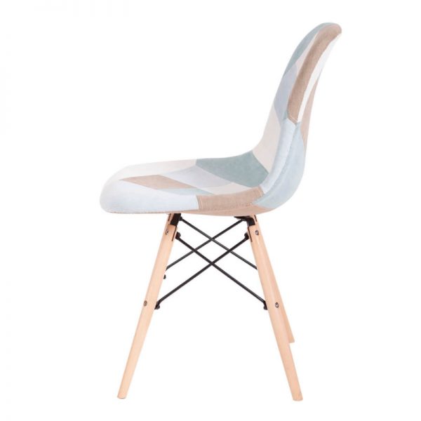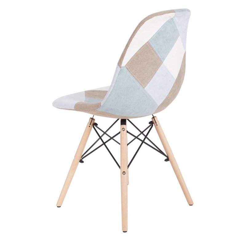 Una silla de diseño actual, con patas de madera de haya y varilla metálica de refuerzo de las patas.