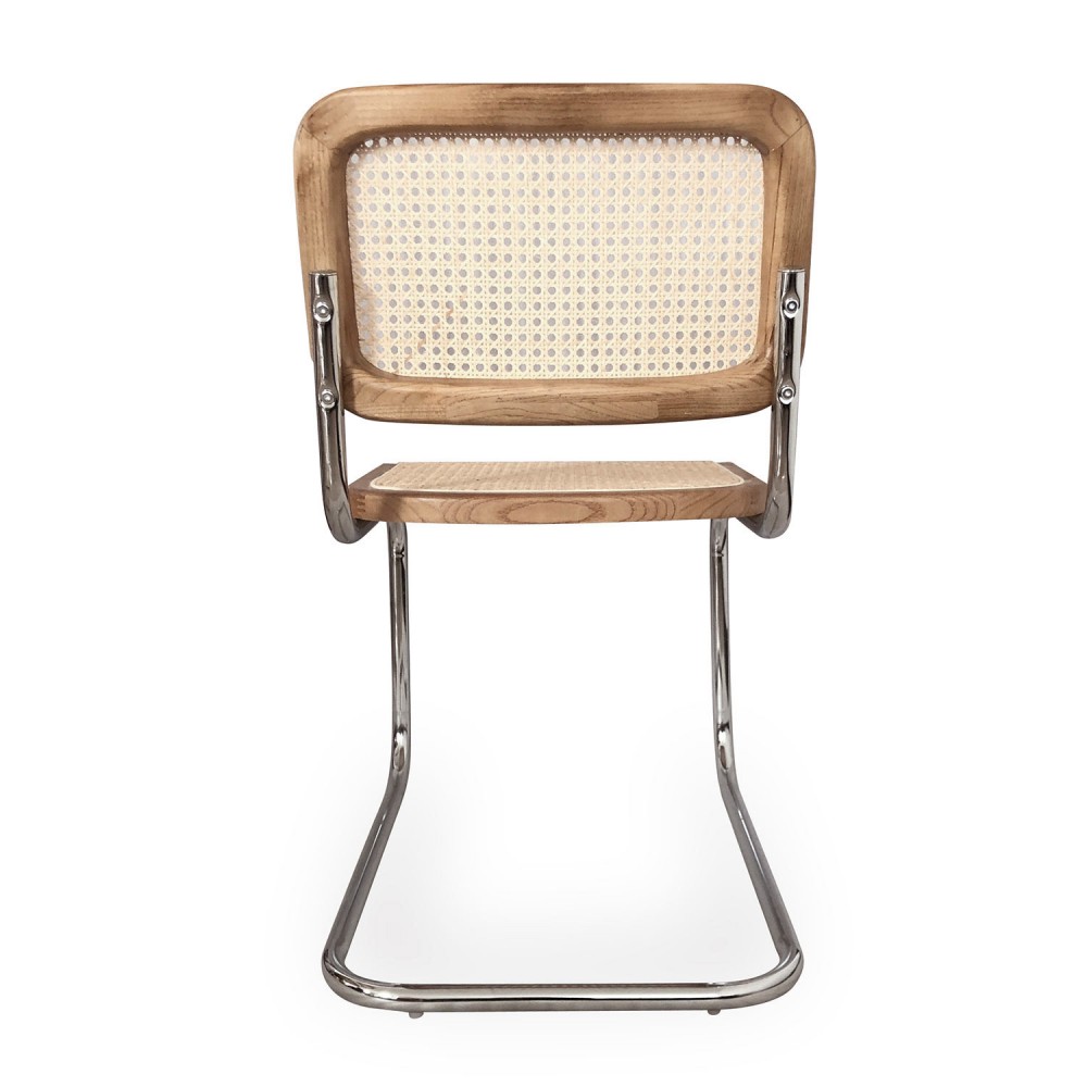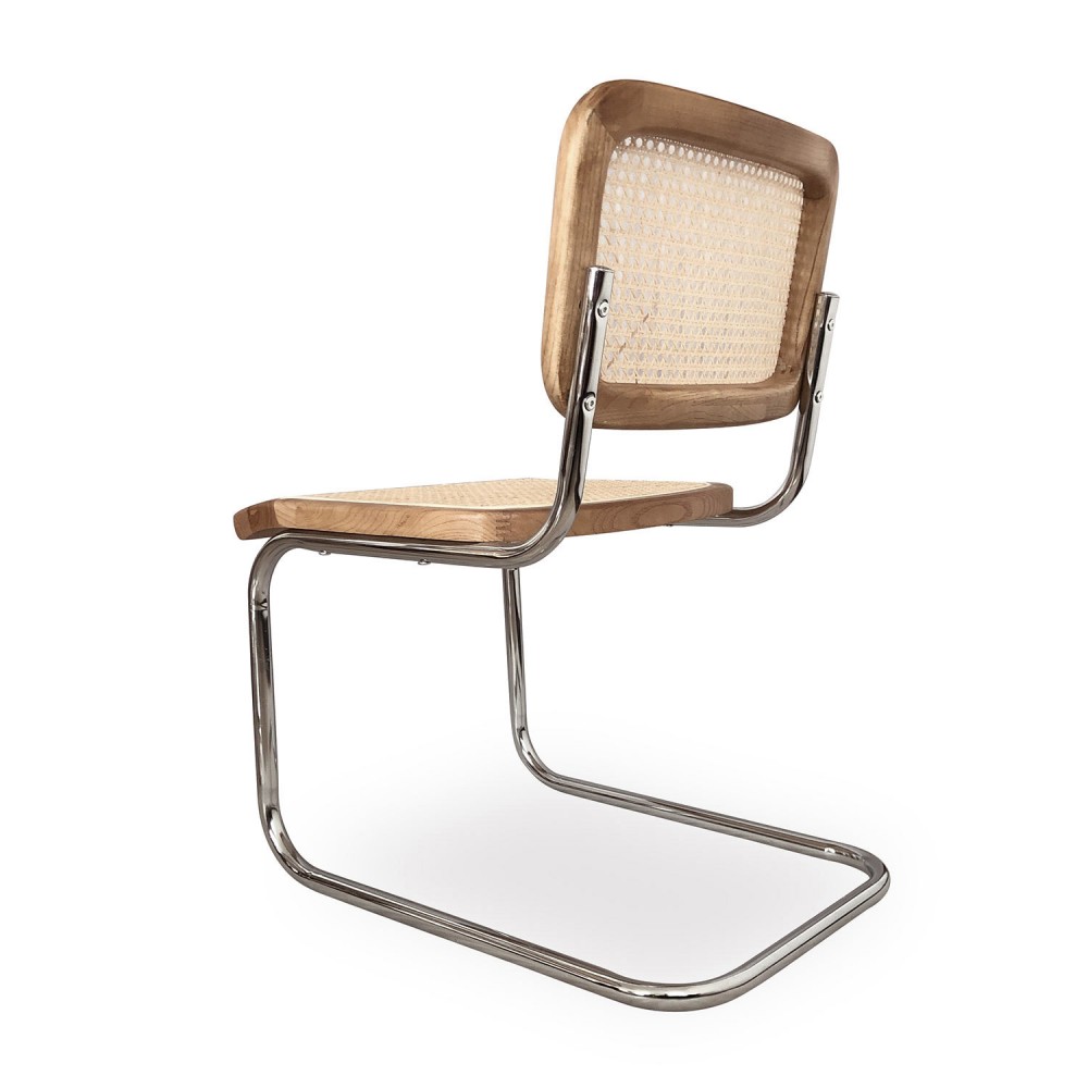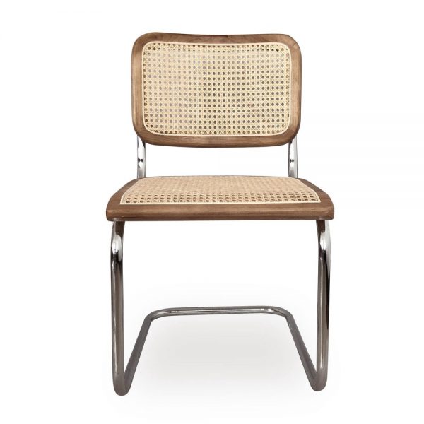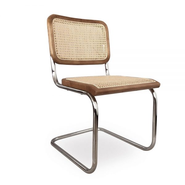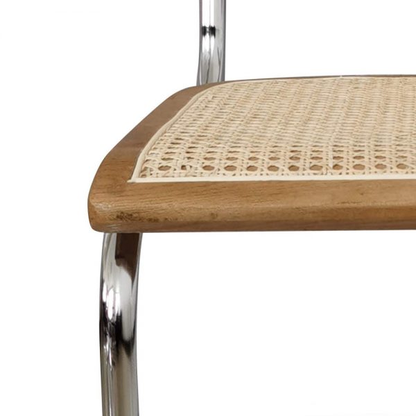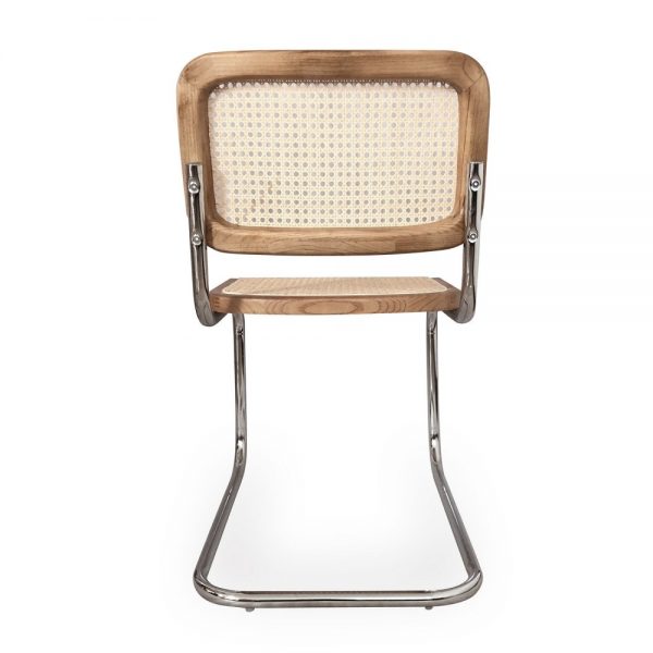 Silla con patas de tubo de acero cromado. Forma curvada que aporta a la silla cierta flexibilidad y balanceo. Con respaldo y asiento en madera de olmo y ratán natural.
