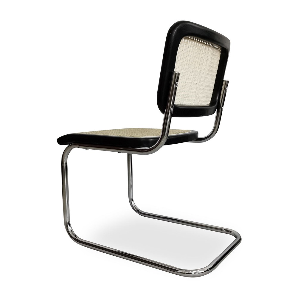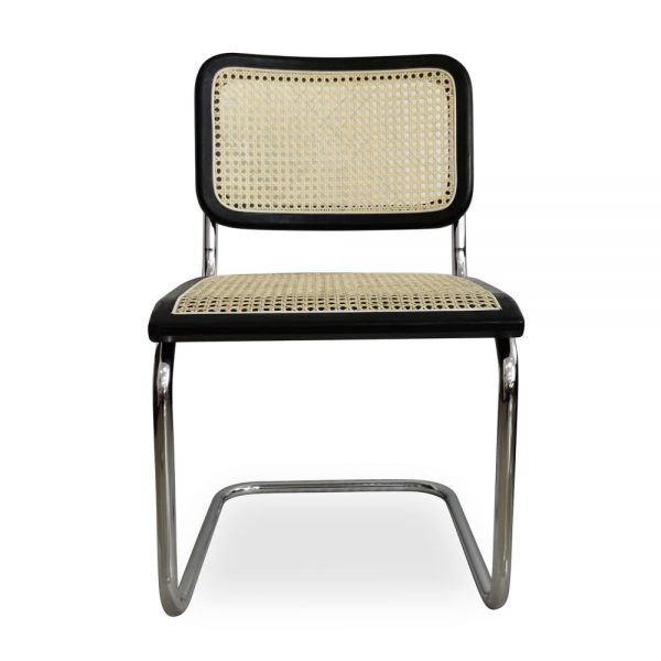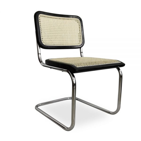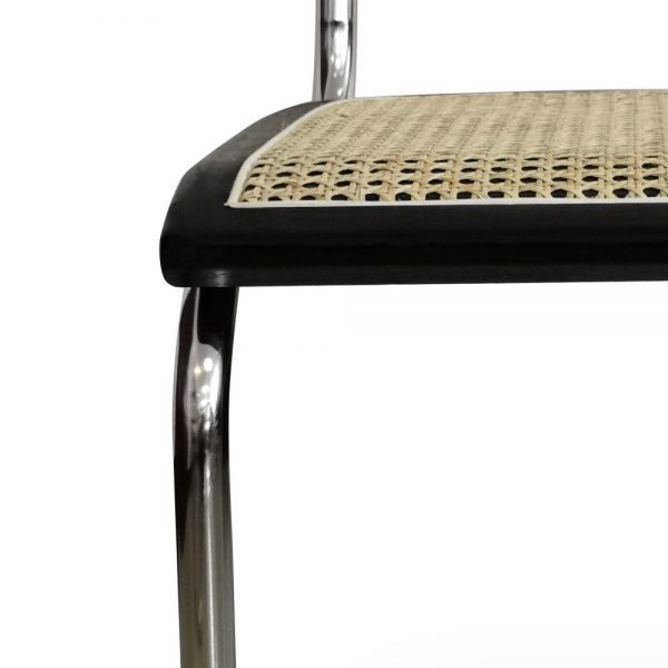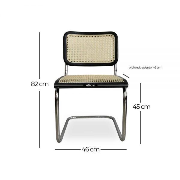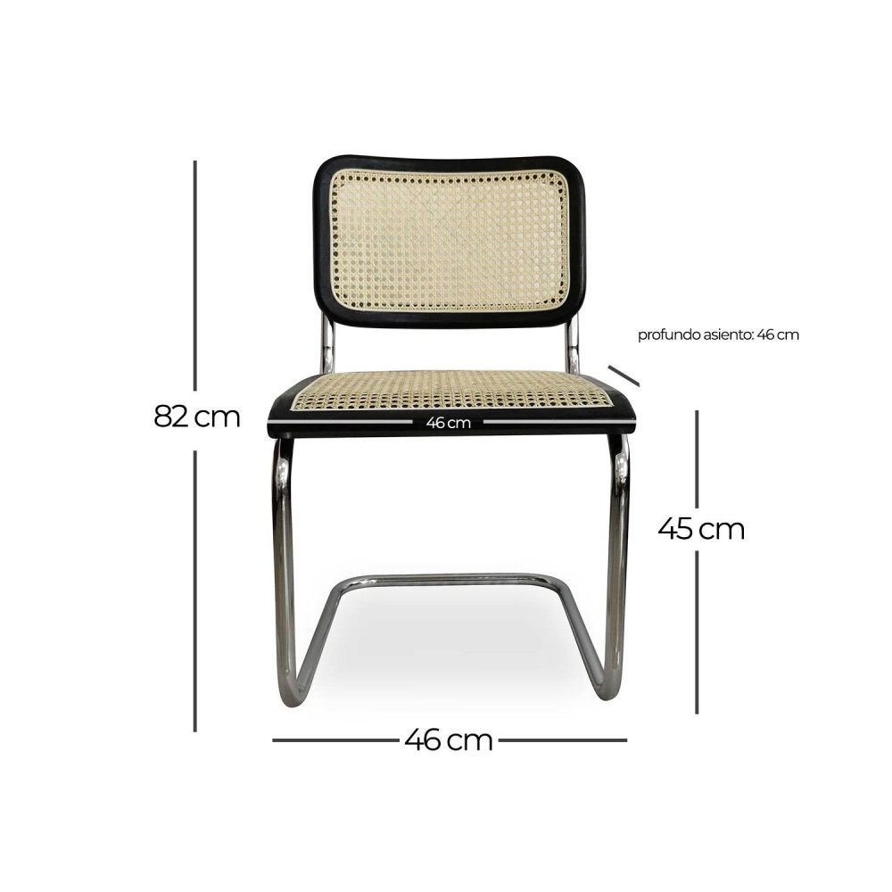 Silla con patas de tubo de acero cromado. Forma curvada que aporta a la silla cierta flexibilidad y balanceo. Con respaldo y asiento en madera de olmo y ratán natural.
