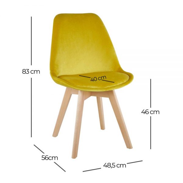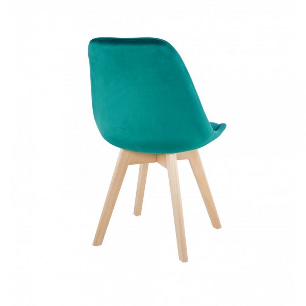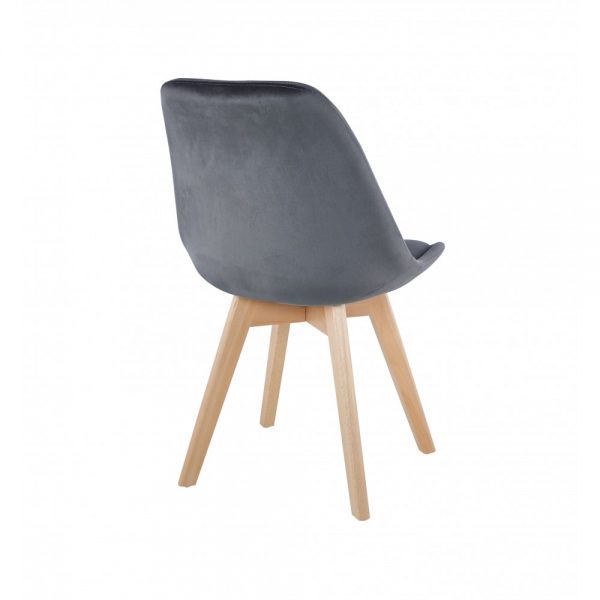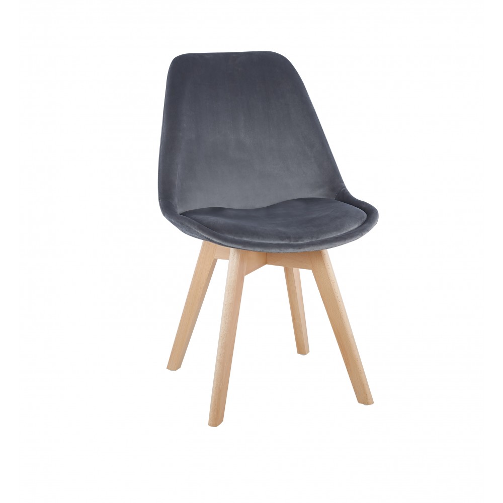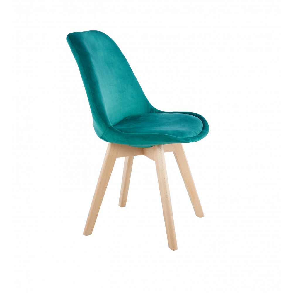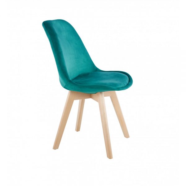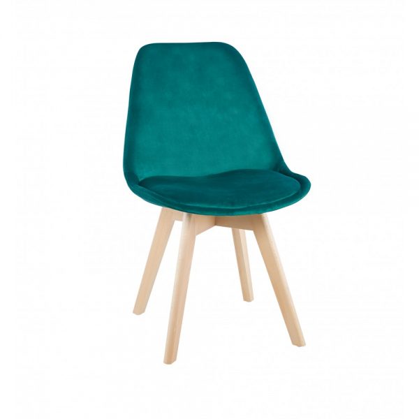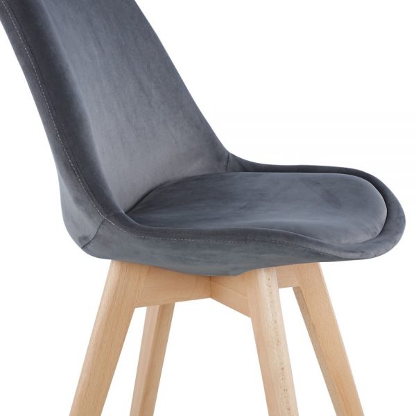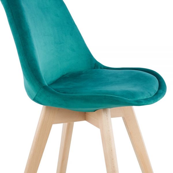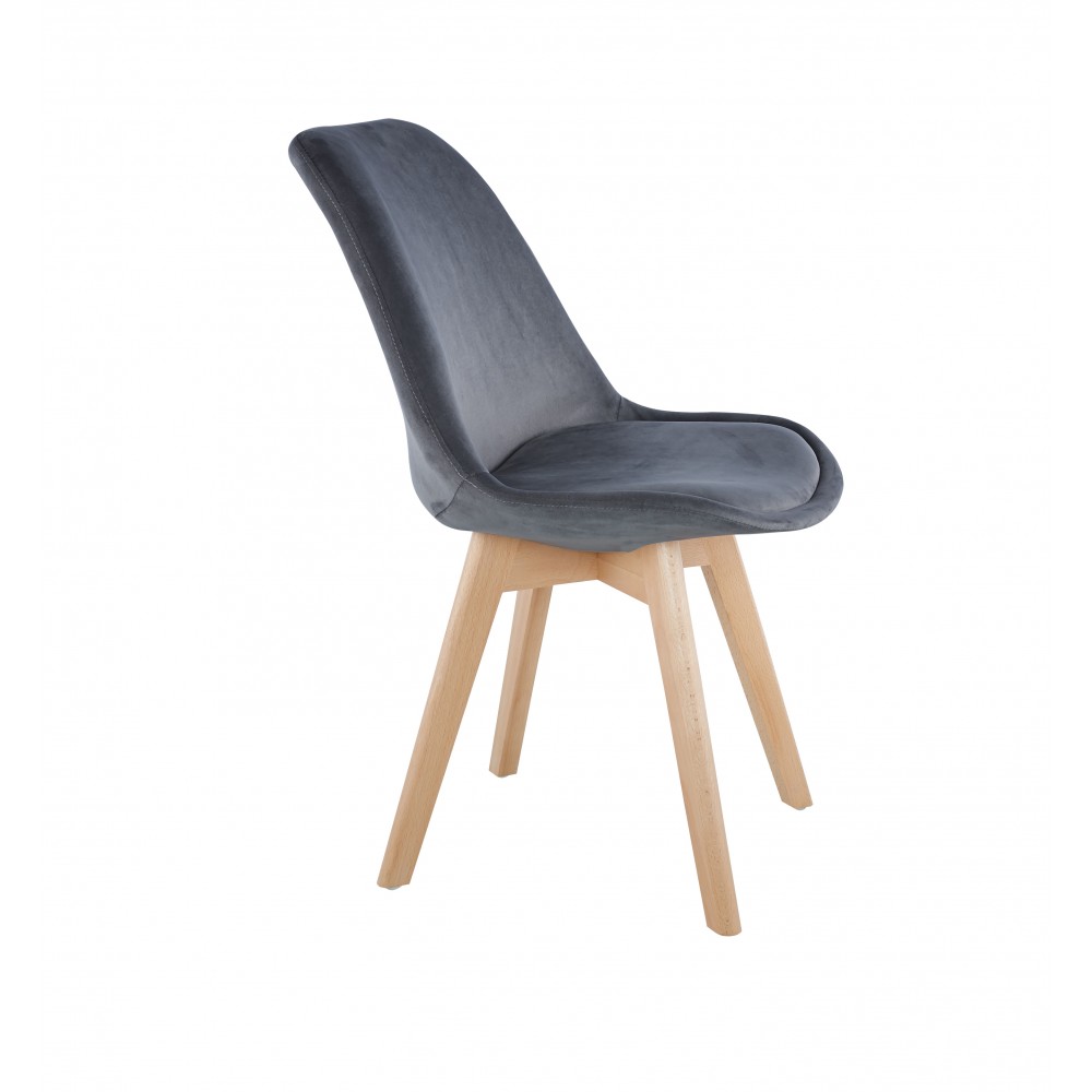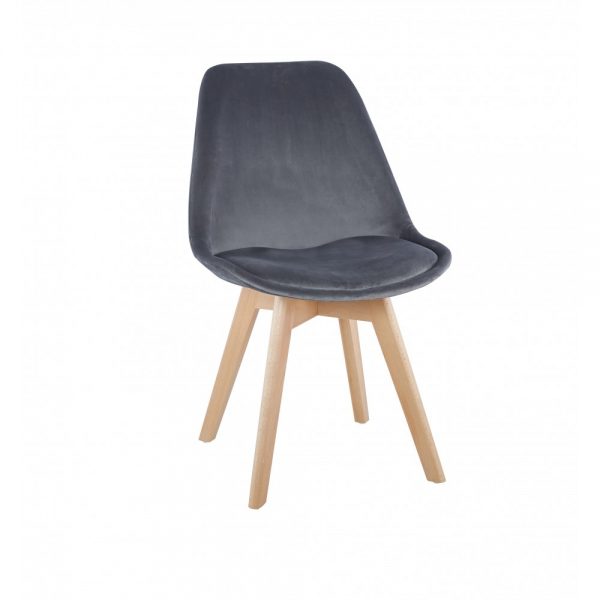 Silla de polipropileno forrada en terciopelo con pata de madera en color natural.