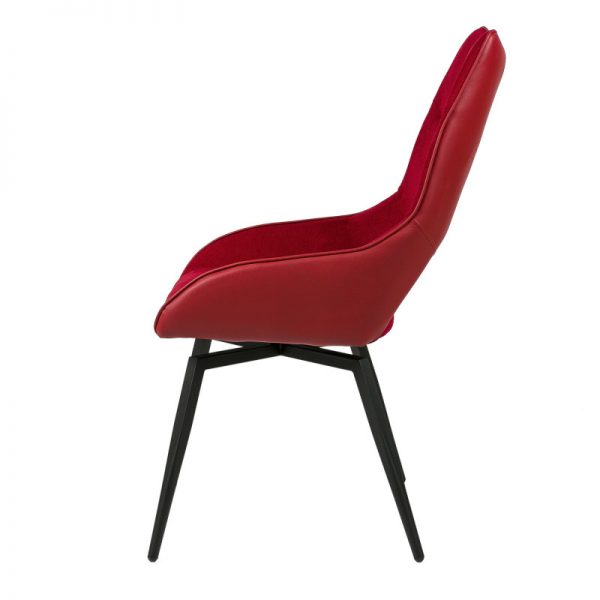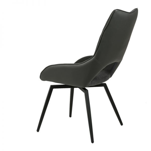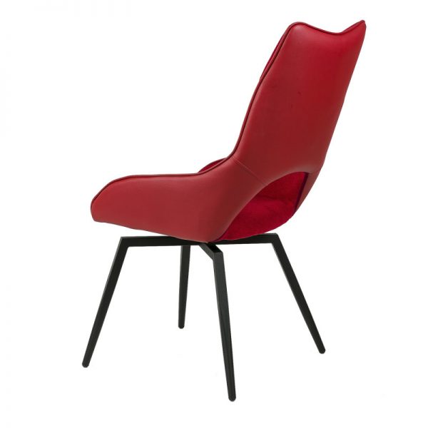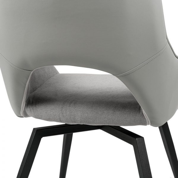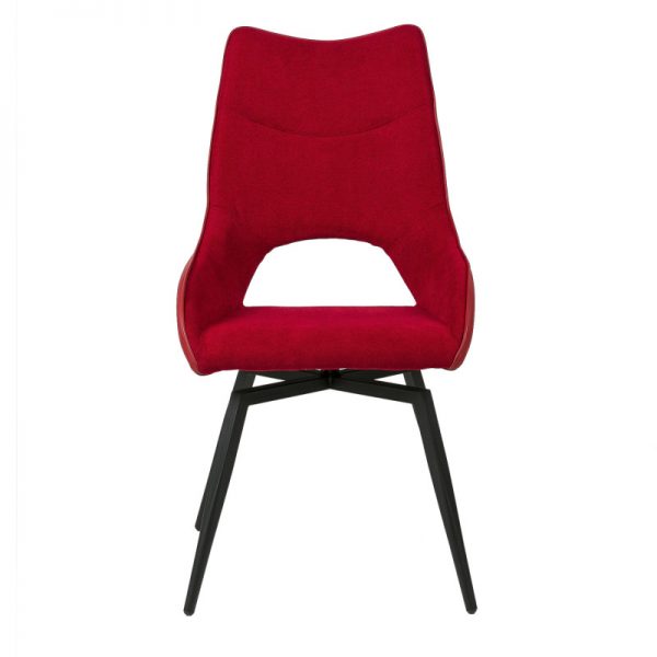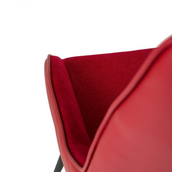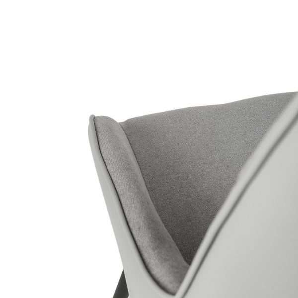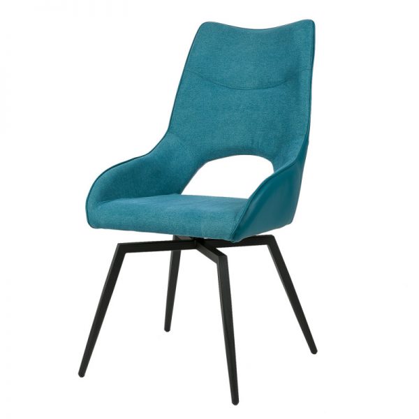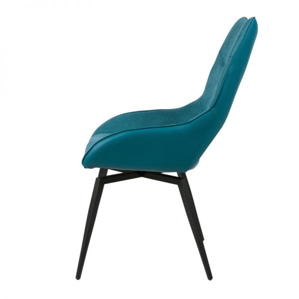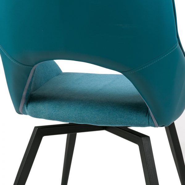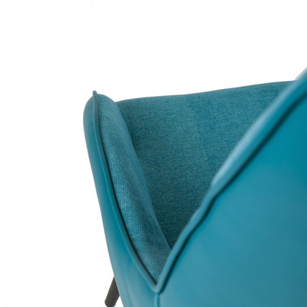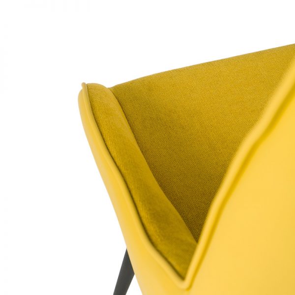 Silla con parte frontal de tela y respaldo de polipiel con unas patas de metal en color negro que crean una forma diferente que dona peculiaridad al articulo.