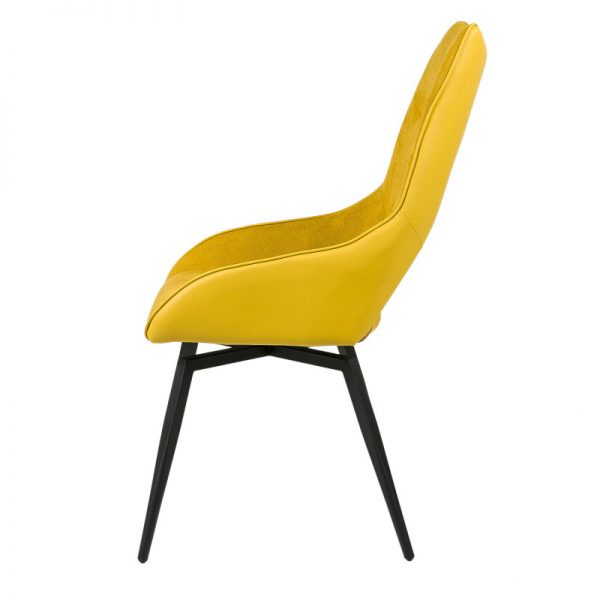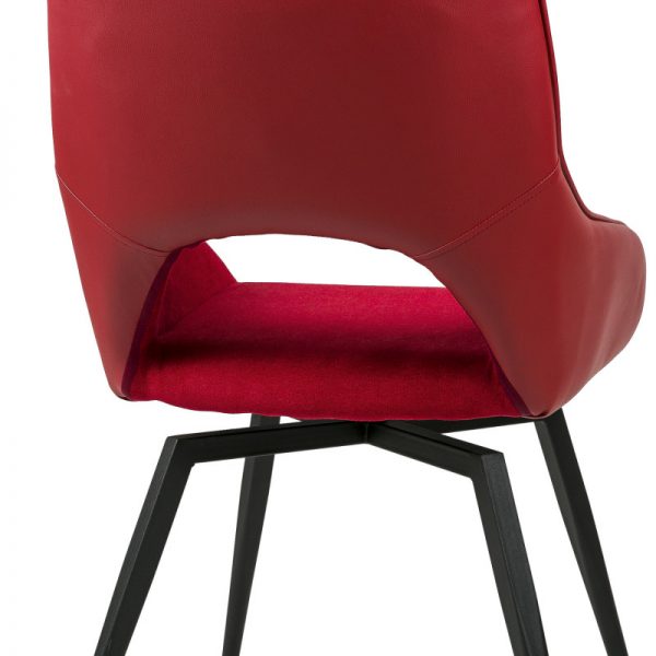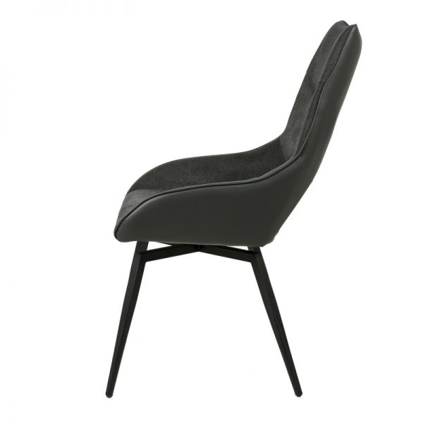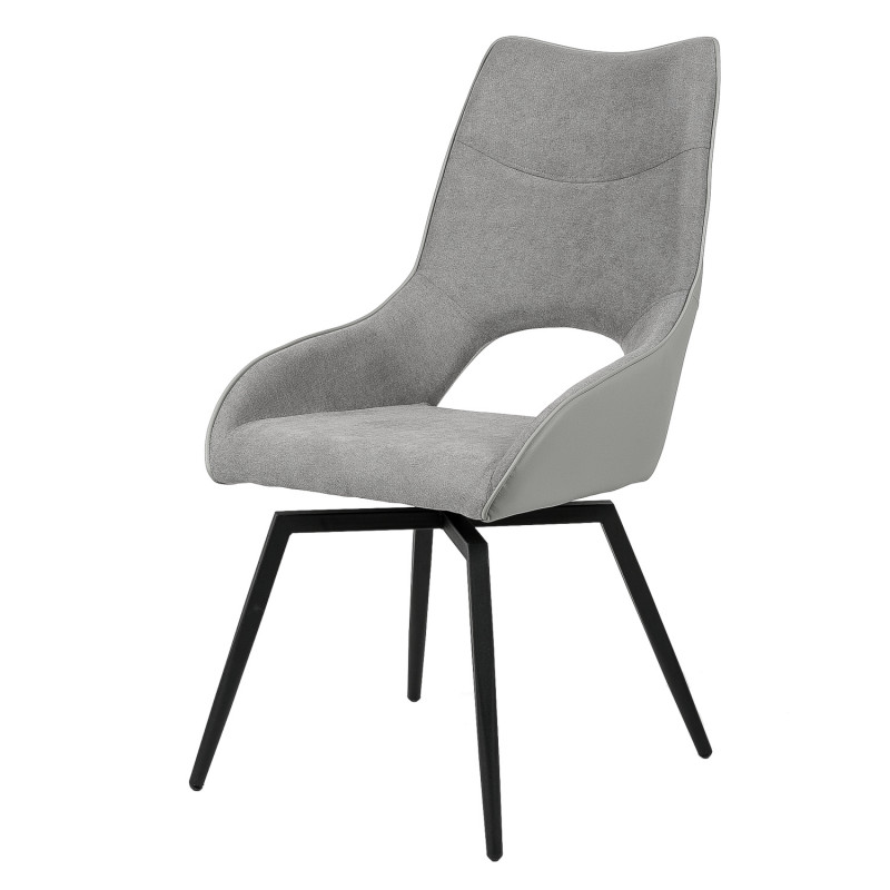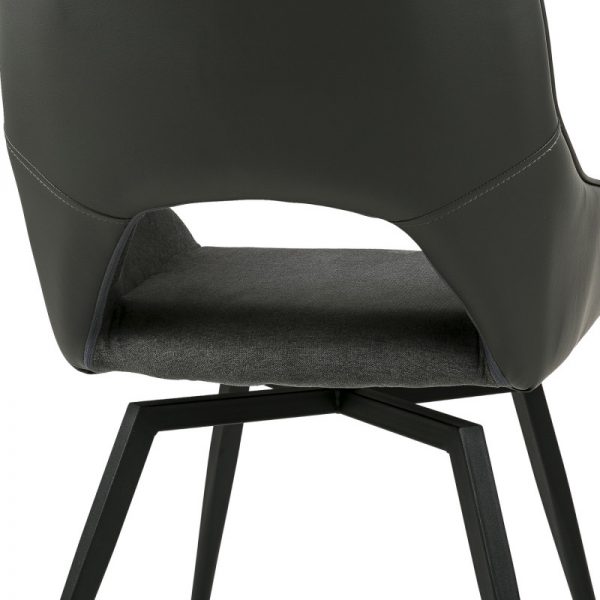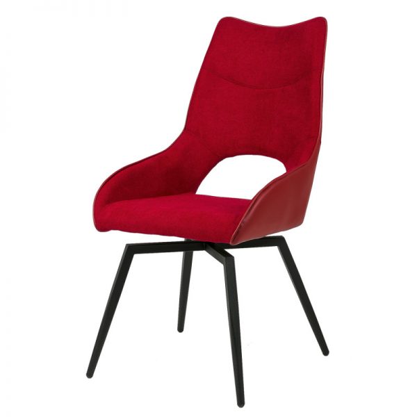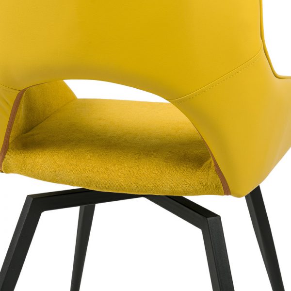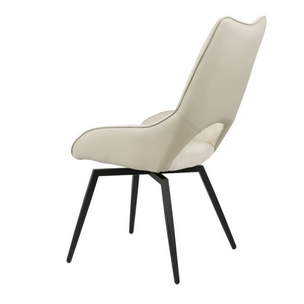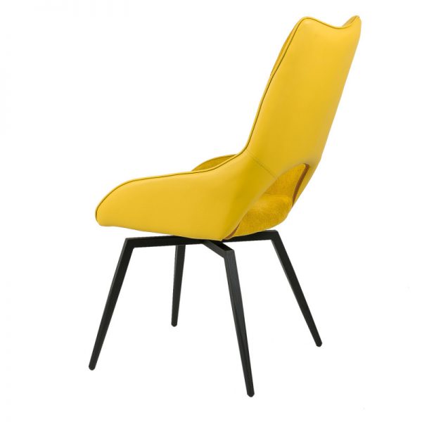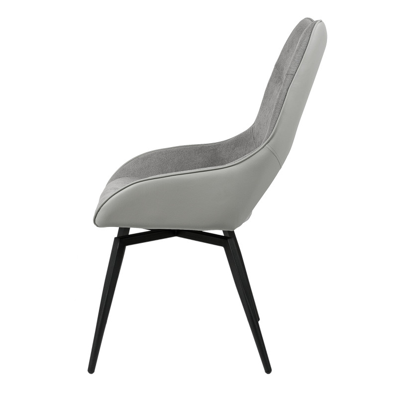 Silla con parte frontal de tela y respaldo de polipiel con unas patas de metal en color negro que crean una forma diferente que dona peculiaridad al articulo.