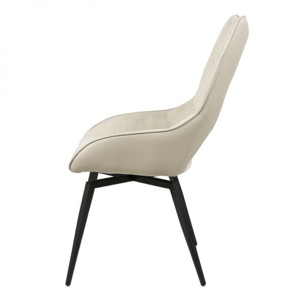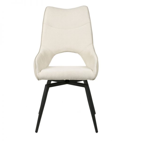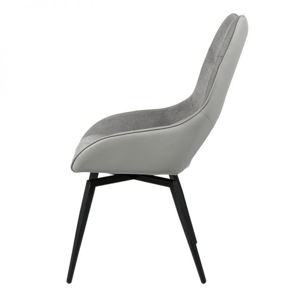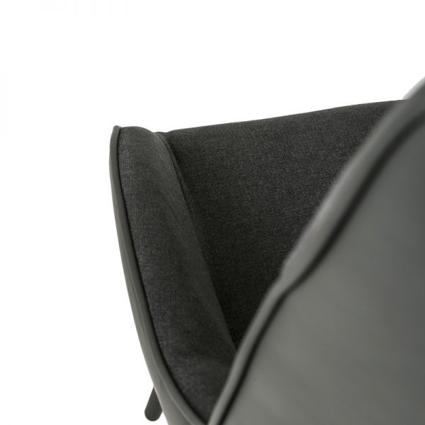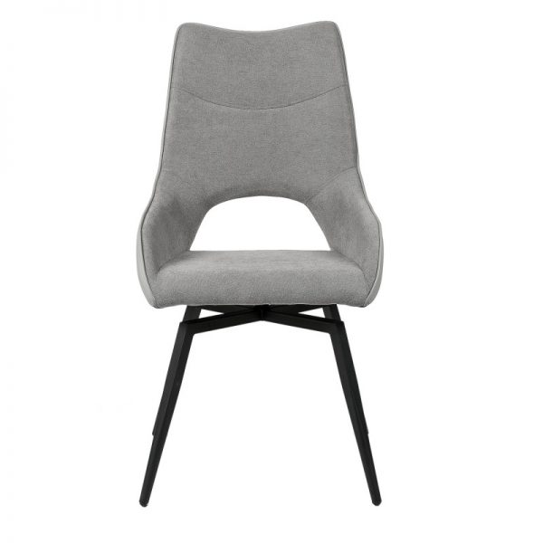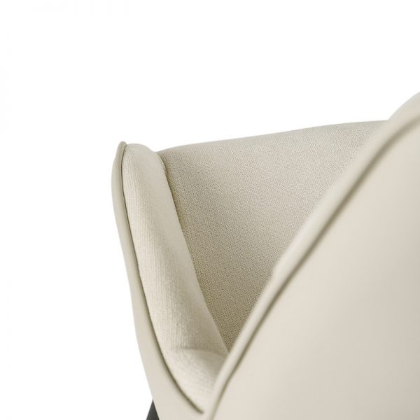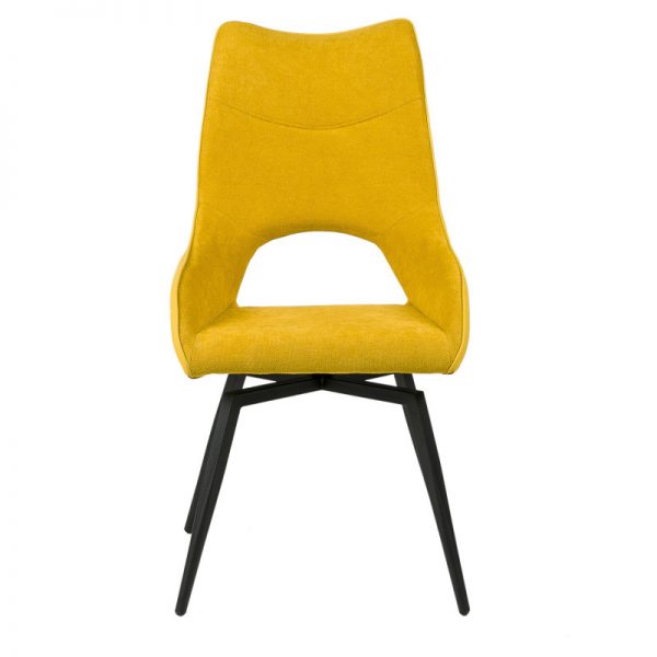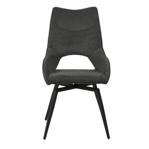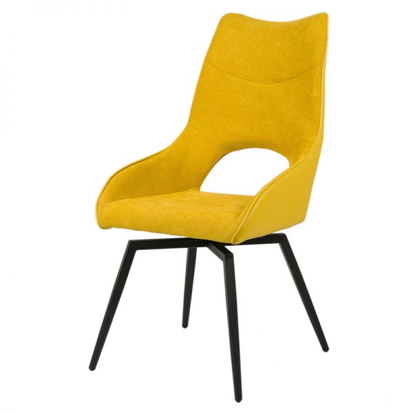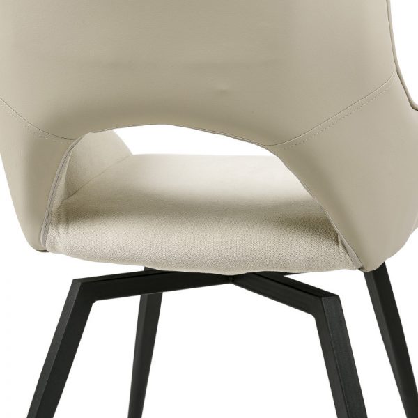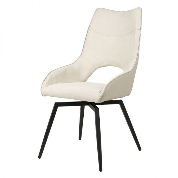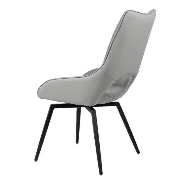 Silla con parte frontal de tela y respaldo de polipiel con unas patas de metal en color negro que crean una forma diferente que dona peculiaridad al articulo.
