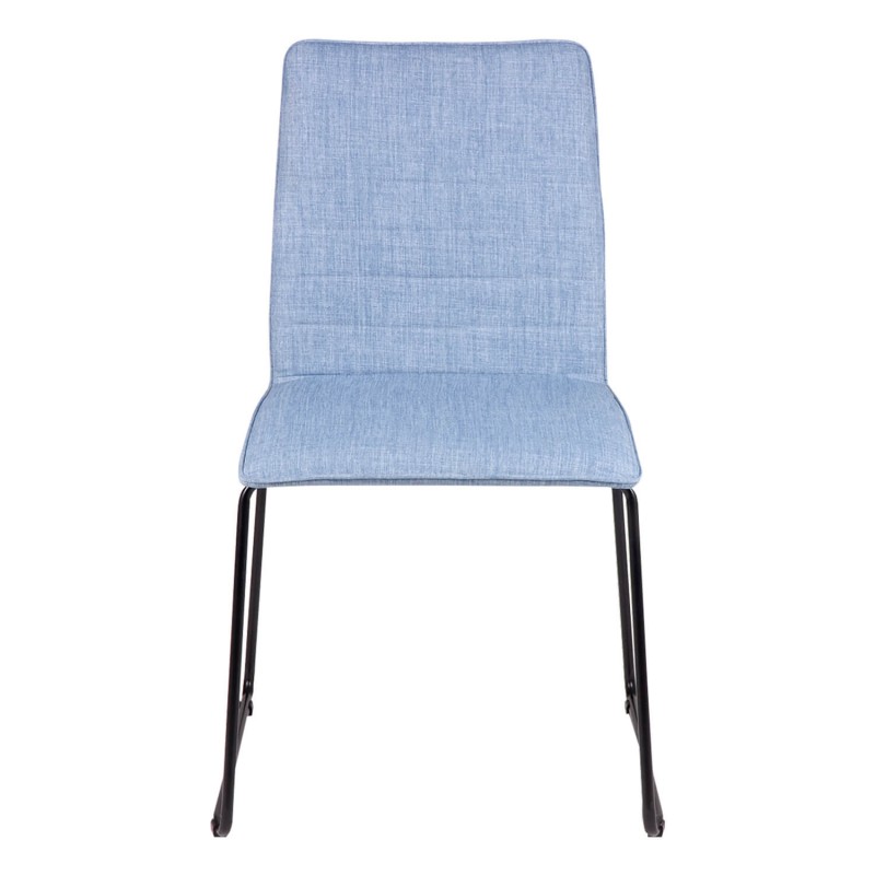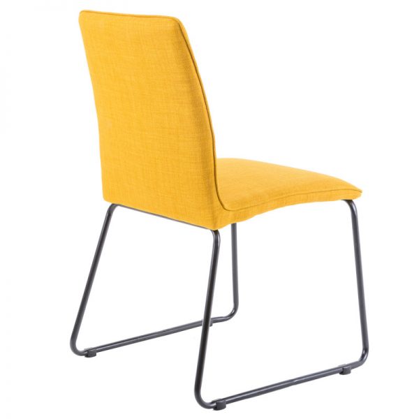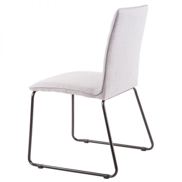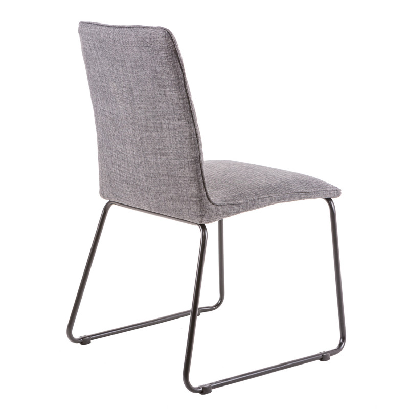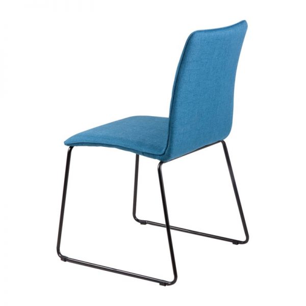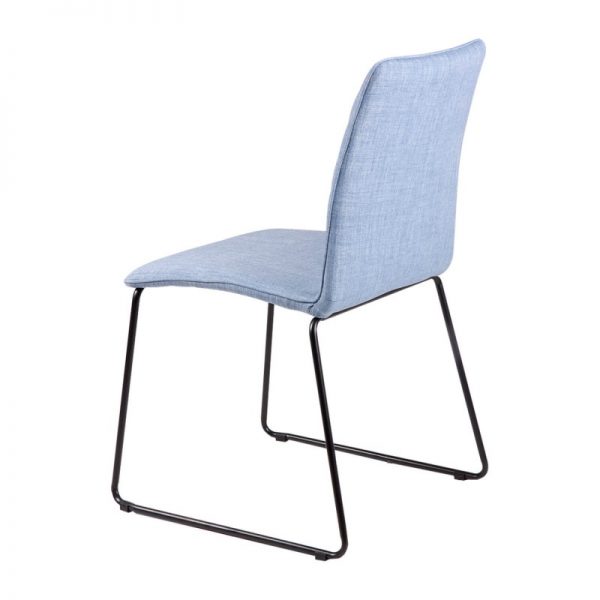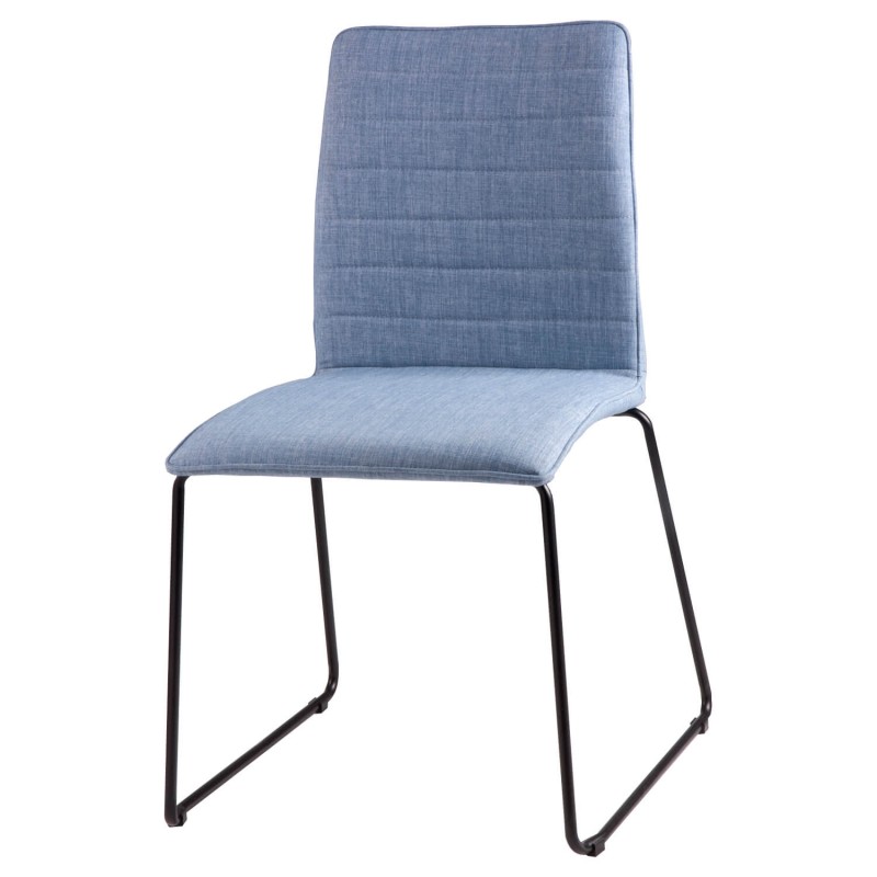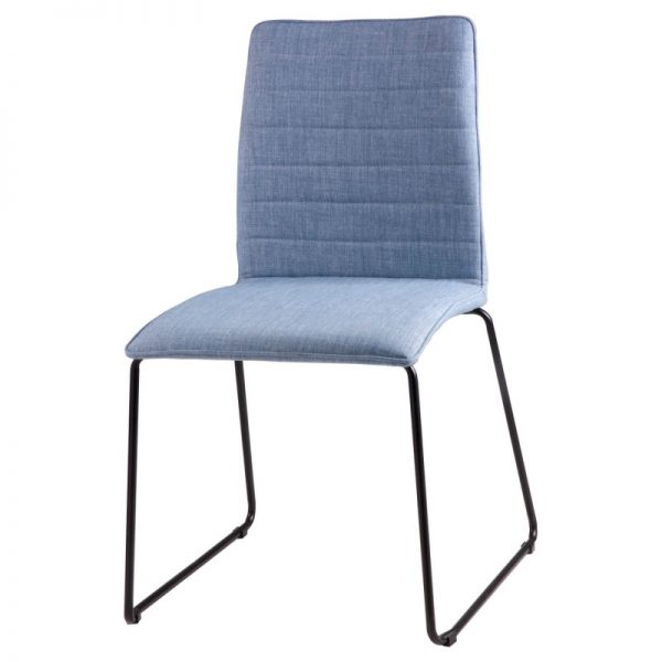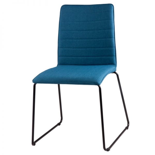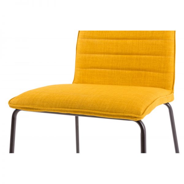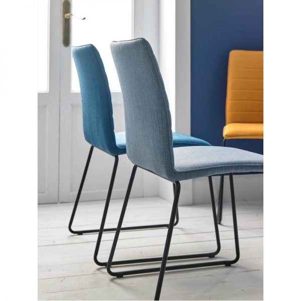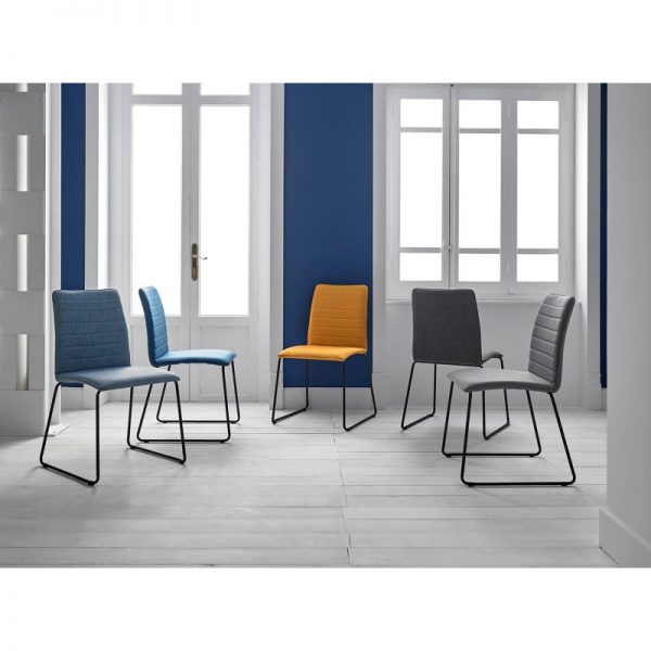 Silla tapizada con estructura de acero y patas en negro. De líneas rectas, tiene un diseño que destaca por su sencillez y ligereza.