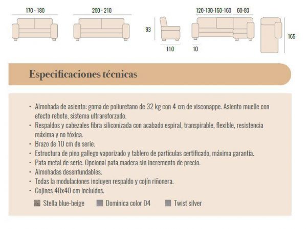 Medidas: ancho total 260 / fondo sofá 110 / fondo chaise 165 / altura 93 cm.