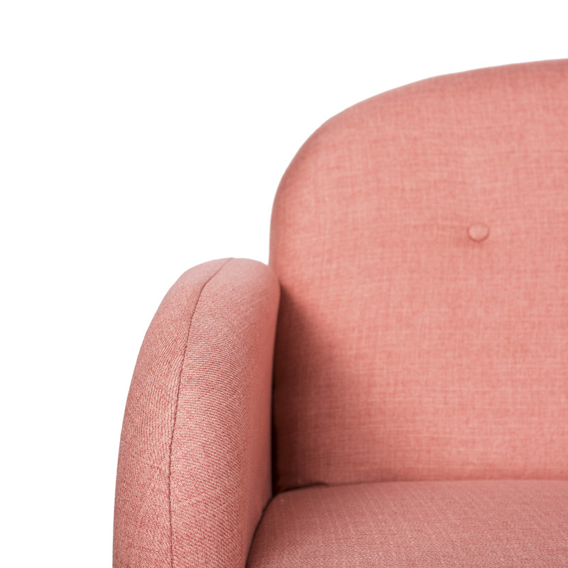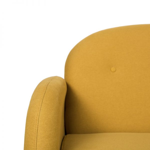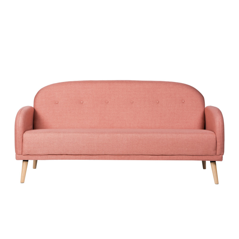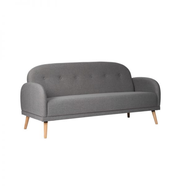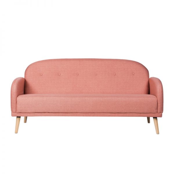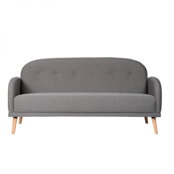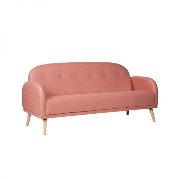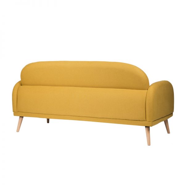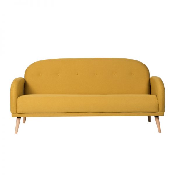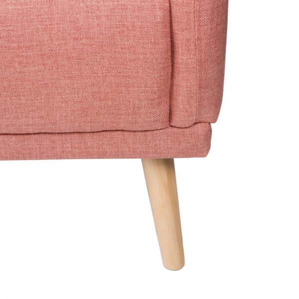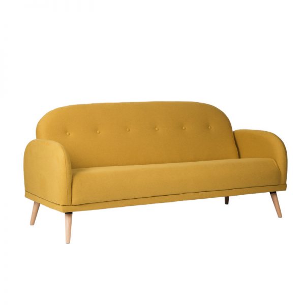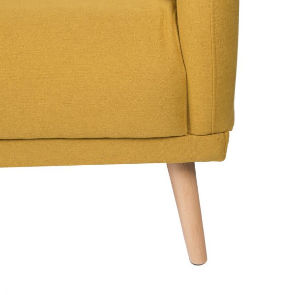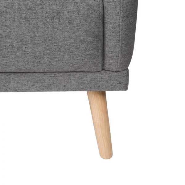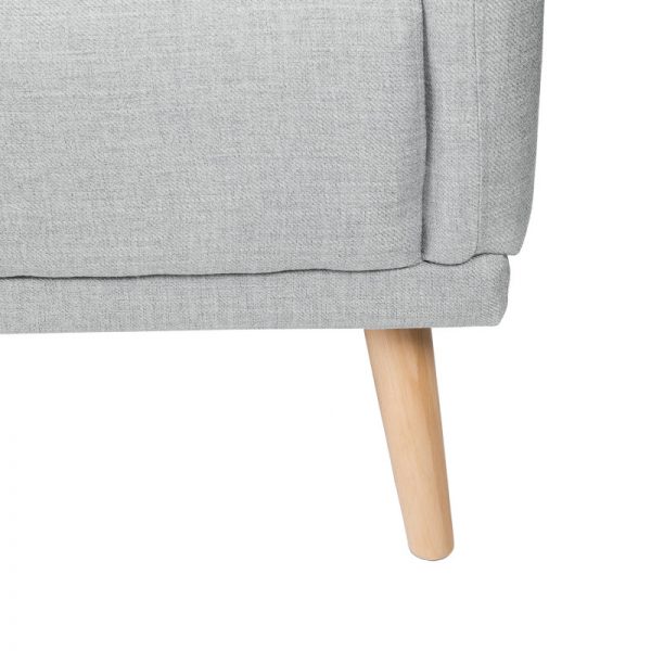 Sofá tapizado con patas de madera ligeramente inclinadas acabadas en color natural.