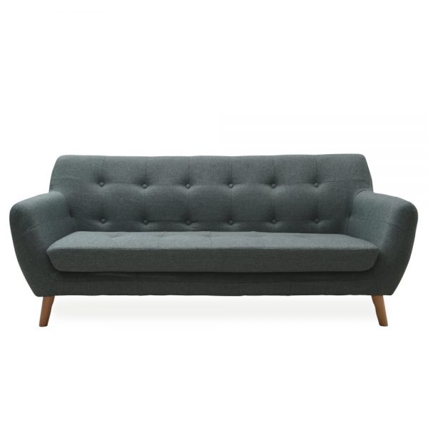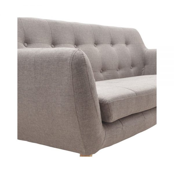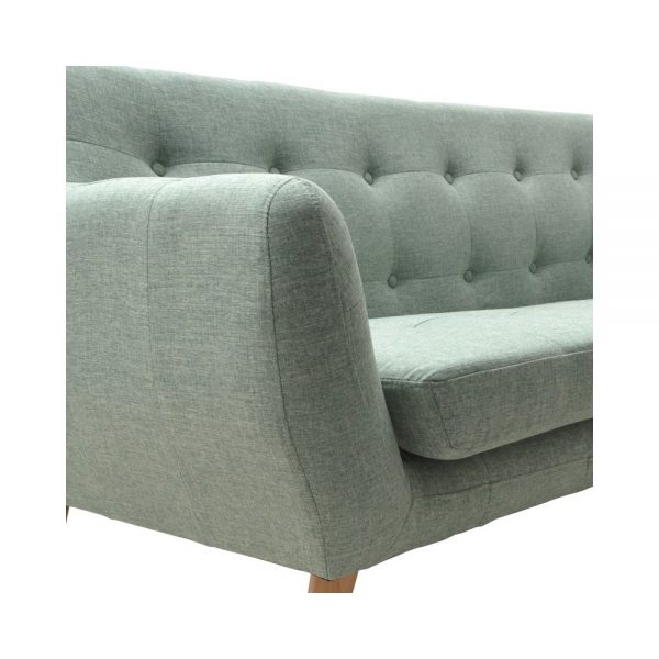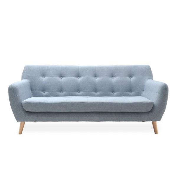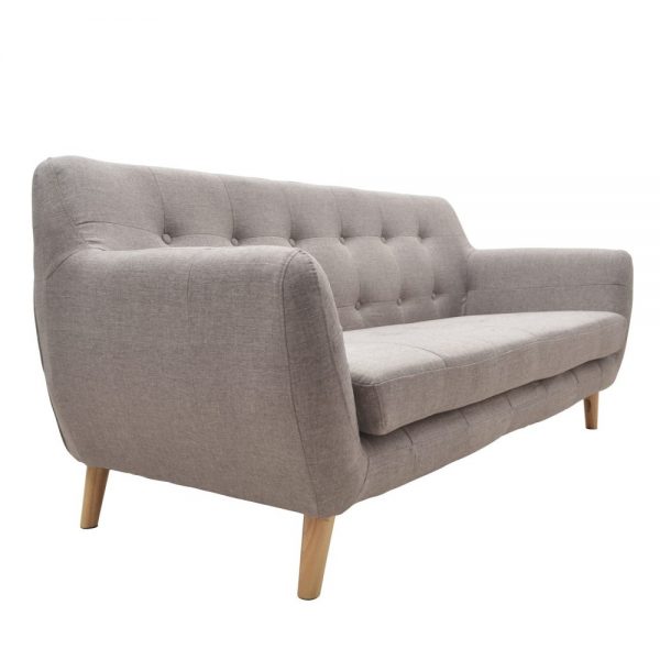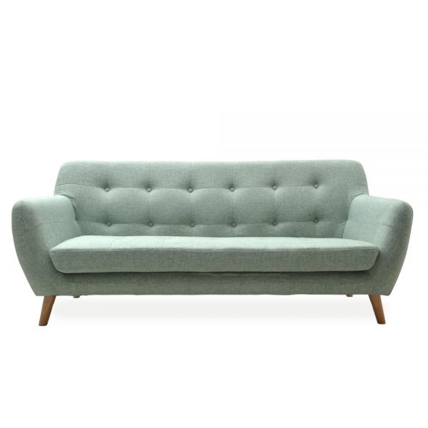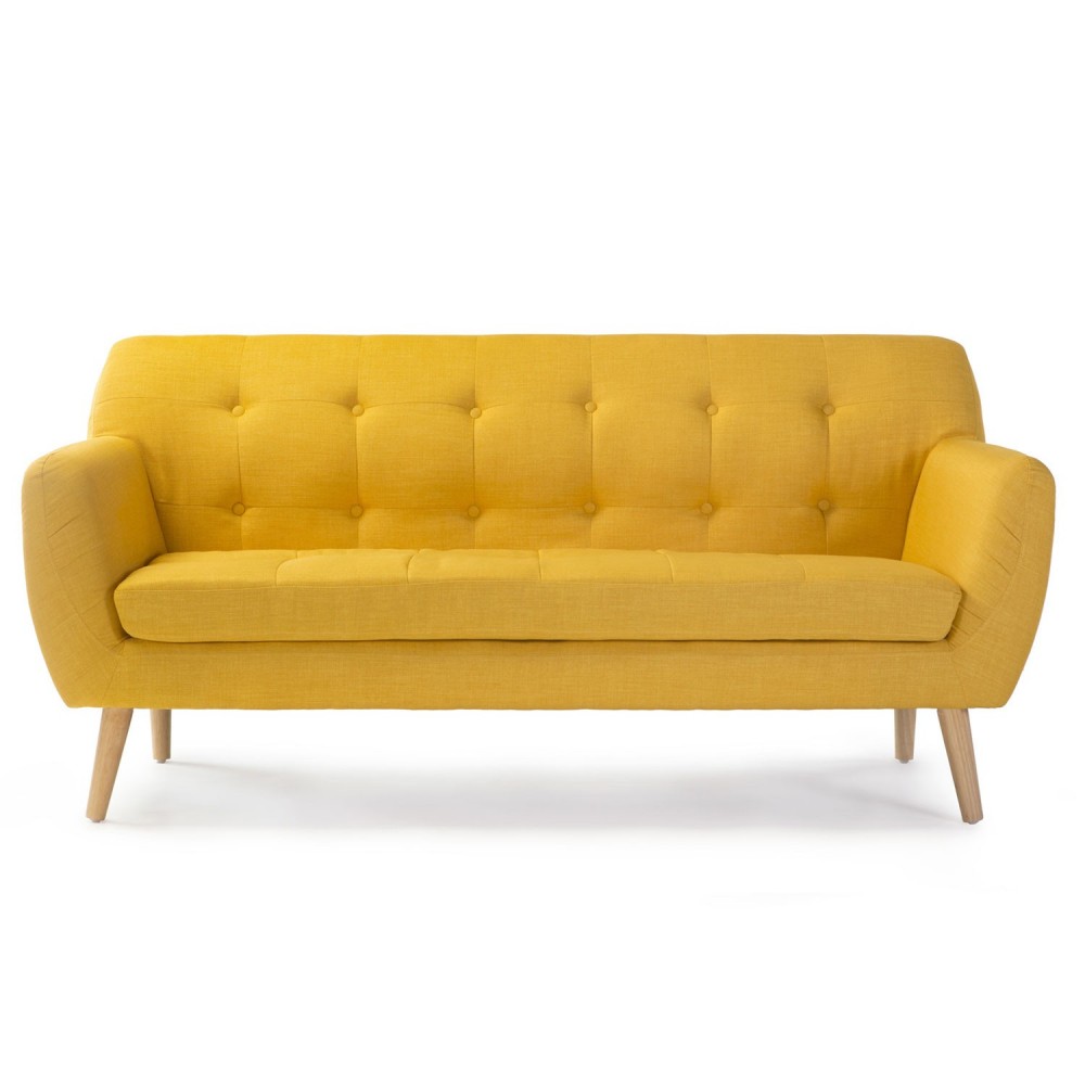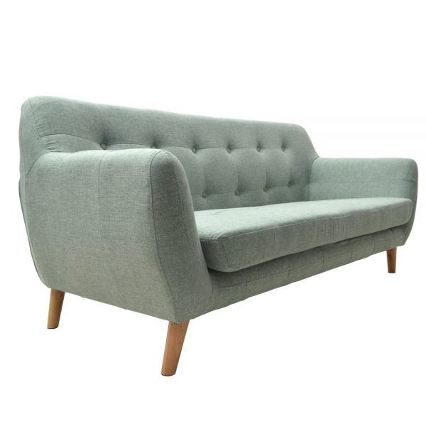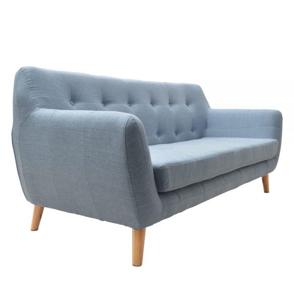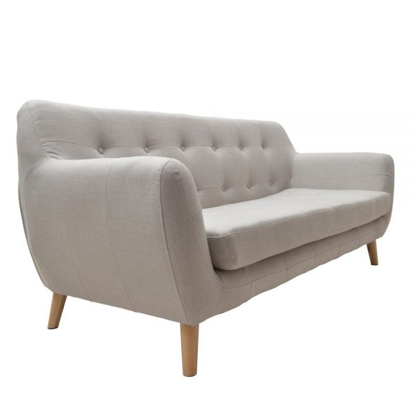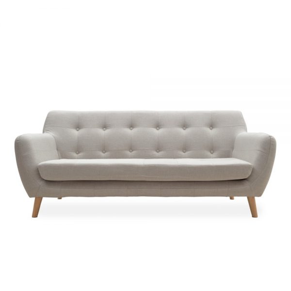 Sofá de tres plazas estilo vintage con patas en madera color natural.