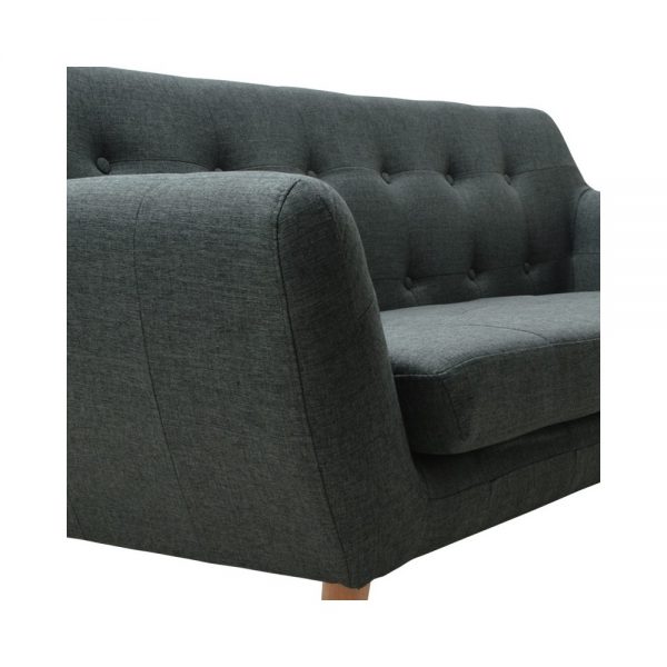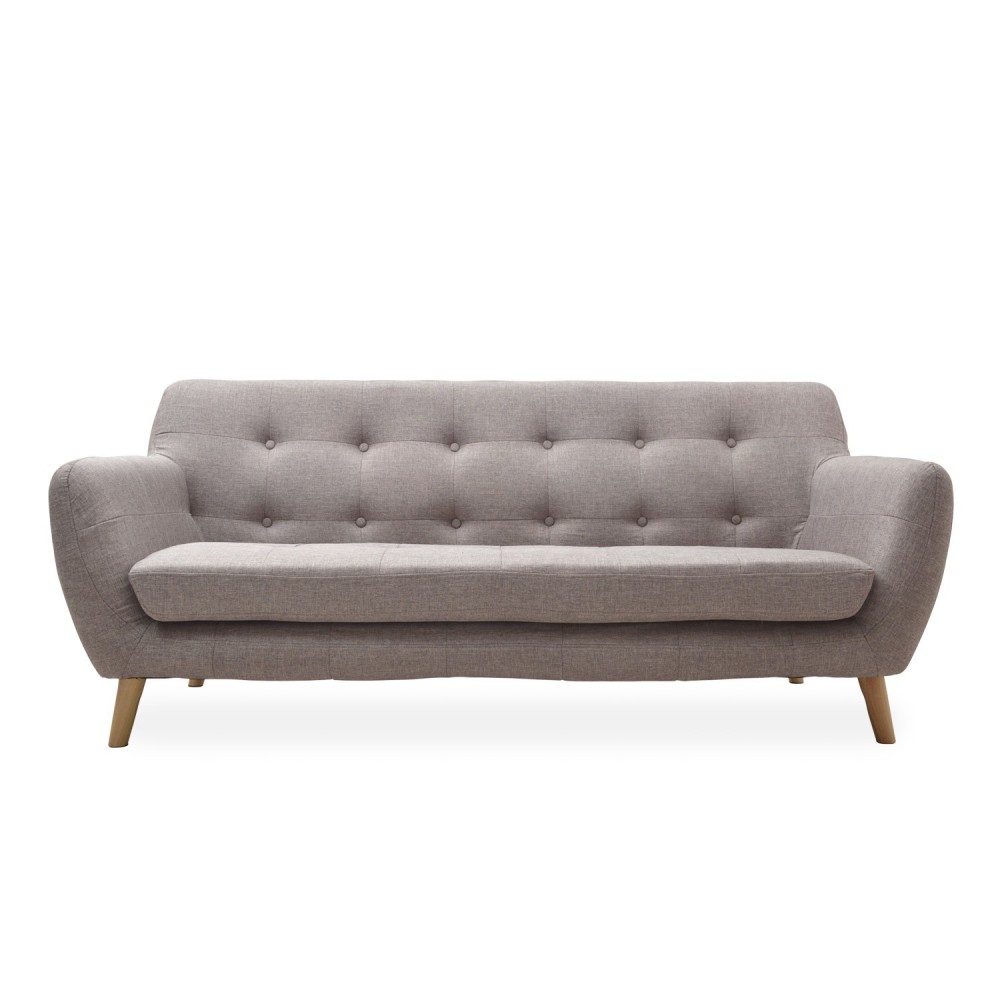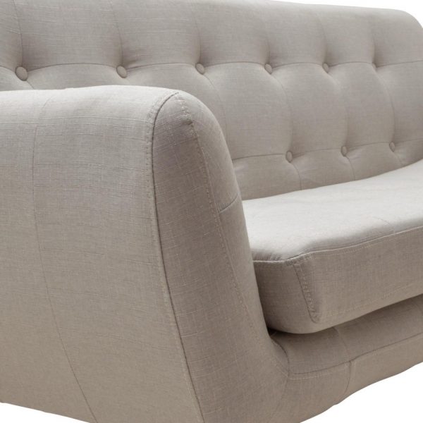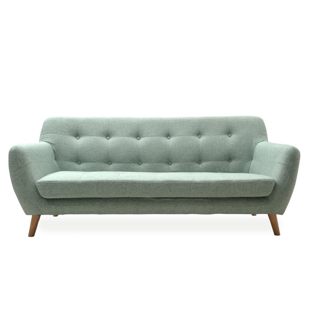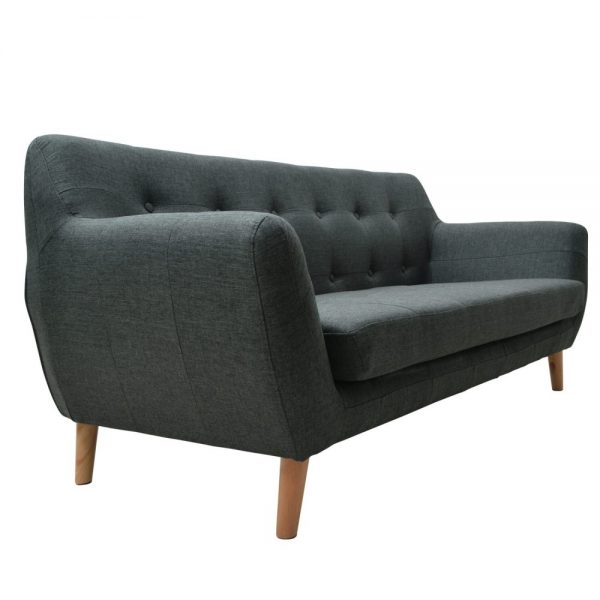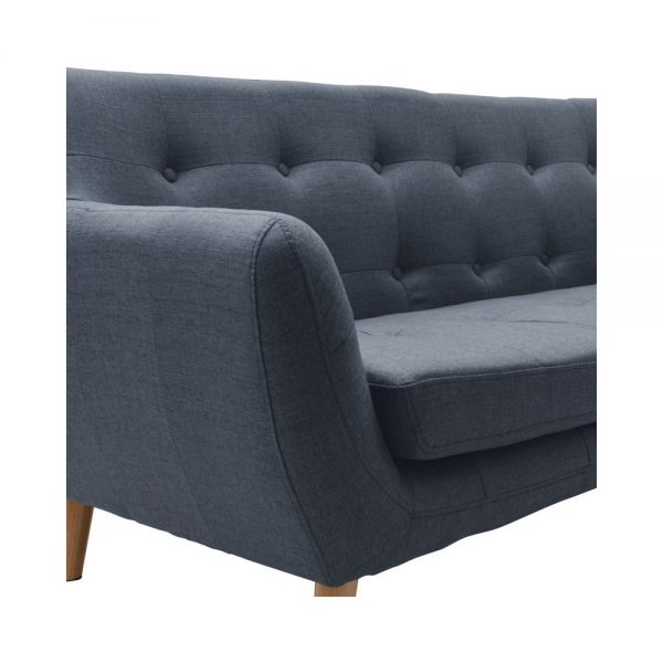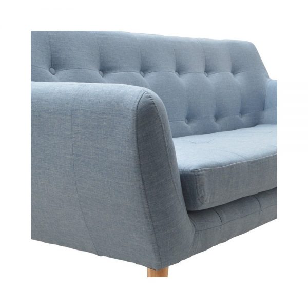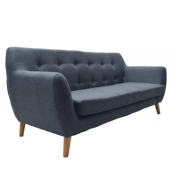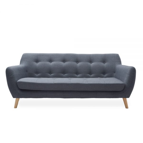 Sofá de tres plazas estilo vintage con patas en madera color natural.