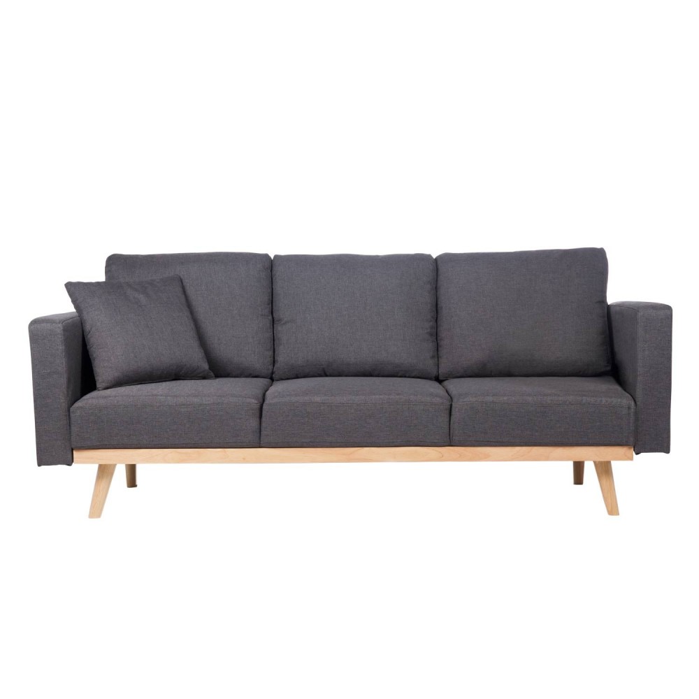 Sofá de tres plazas color gris con patas en madera en color natural.