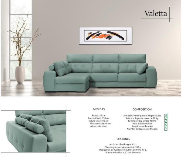 – Opciones: Arcón de Chaise longue 80p. Chaise logue partida reversible 100p. Deslizantes de ruedas con puntos de freno 40p. Brazos reducidos a 20 cm Sin coste.