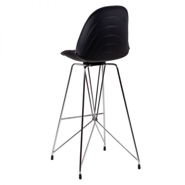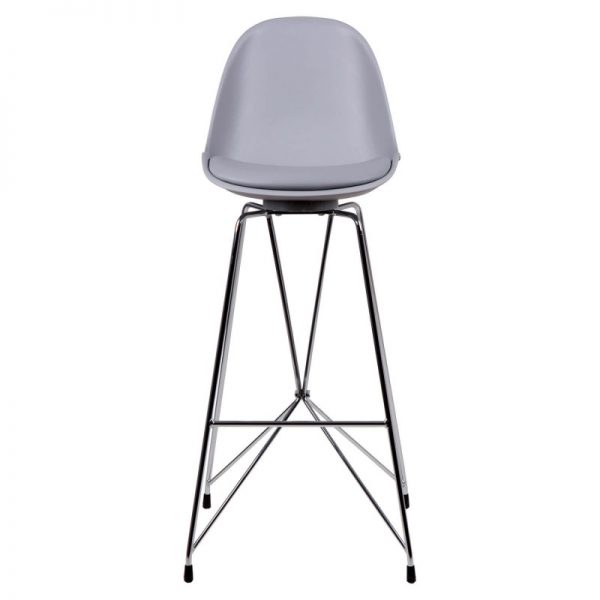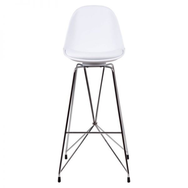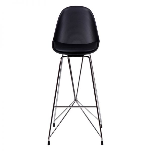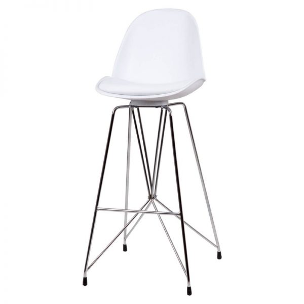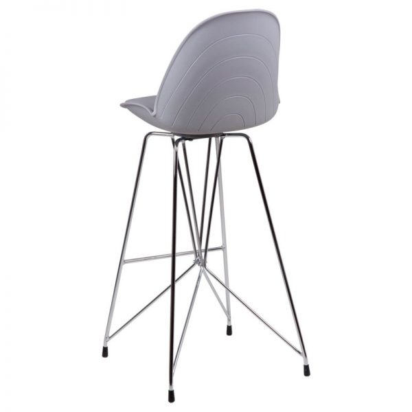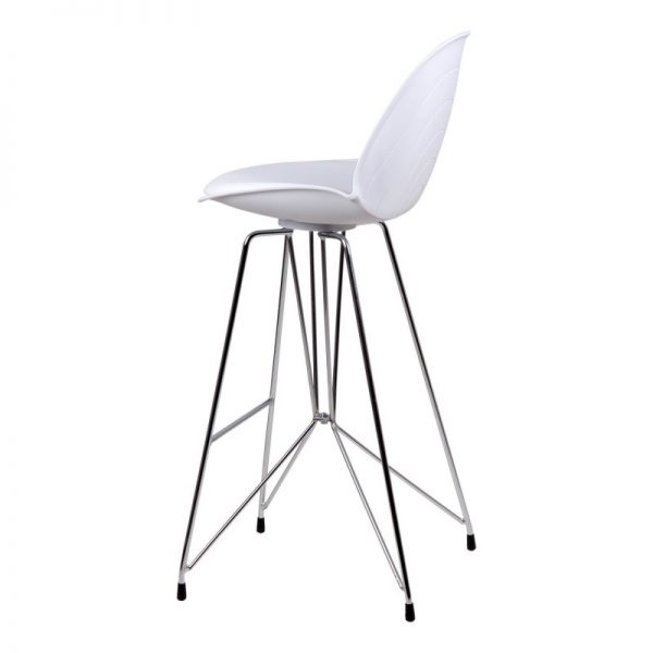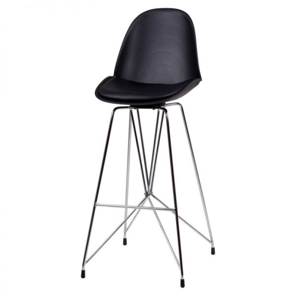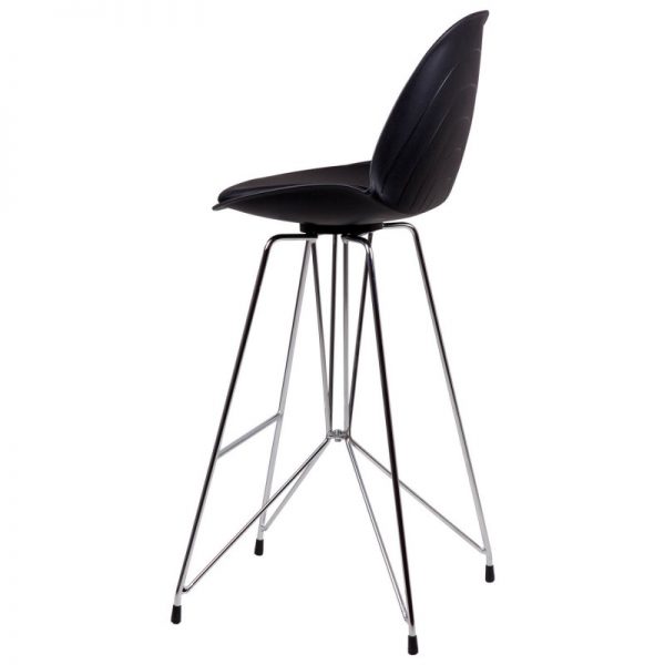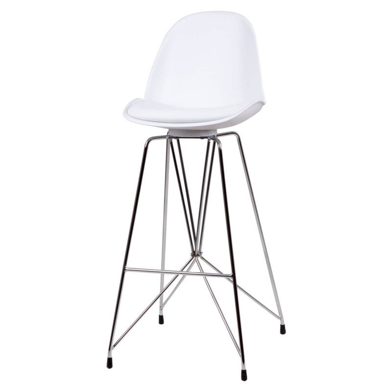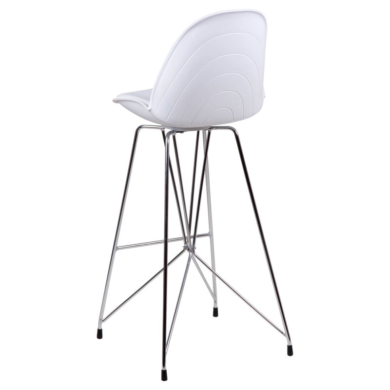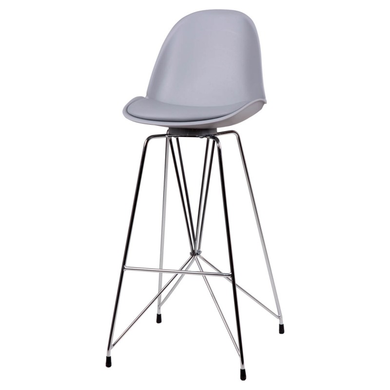 Taburete bar moderno con pata cromada cruzada y asiento curvo en polipropileno y tapizado PU acolchado.