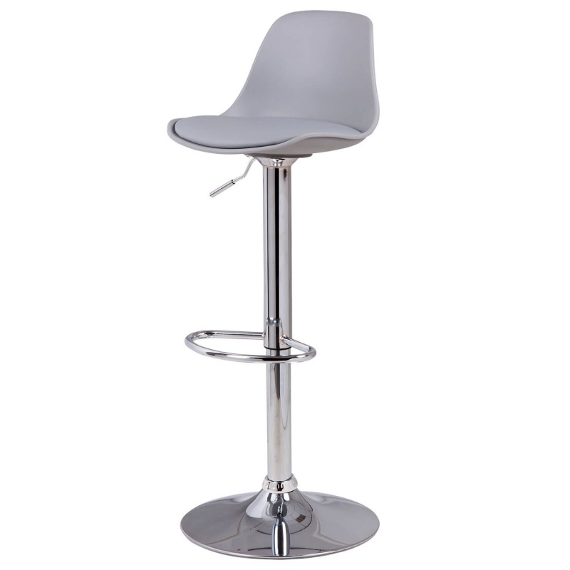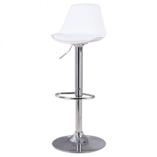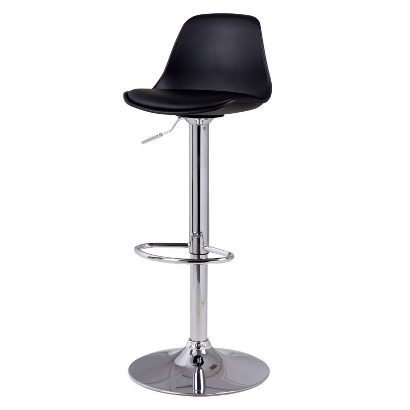 Taburete elevable cromado con soporte pies cromado. Sistema de elevación por pistón. Asiento en plástico polipropileno y con asiento acolchado PU.