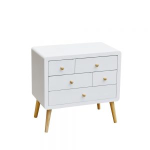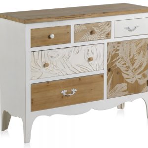 COMODA DE MADERA BLANCA 5 CAJONES Y UNA PUERTA TAPA NATURAL